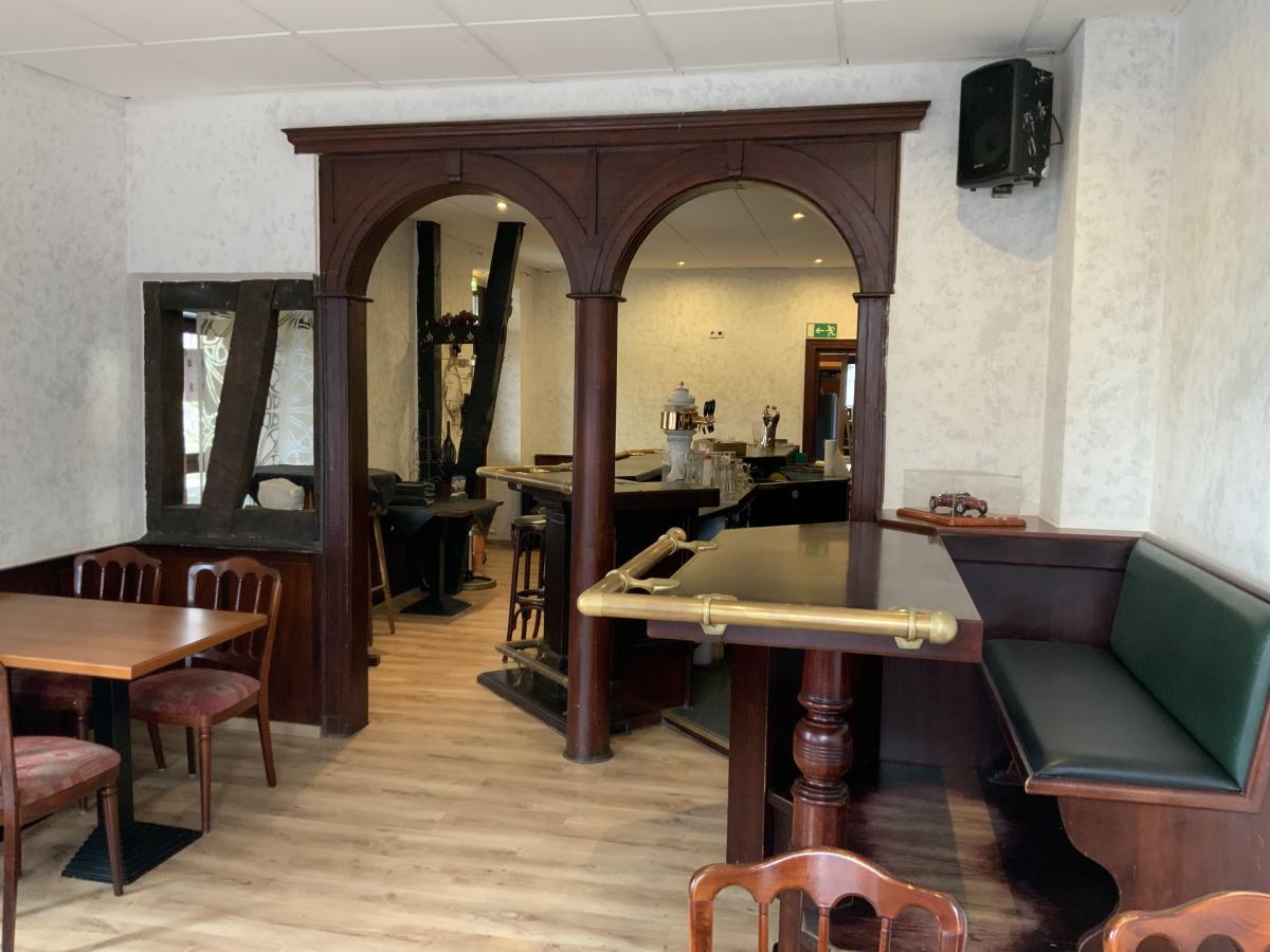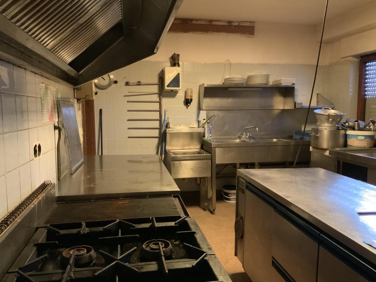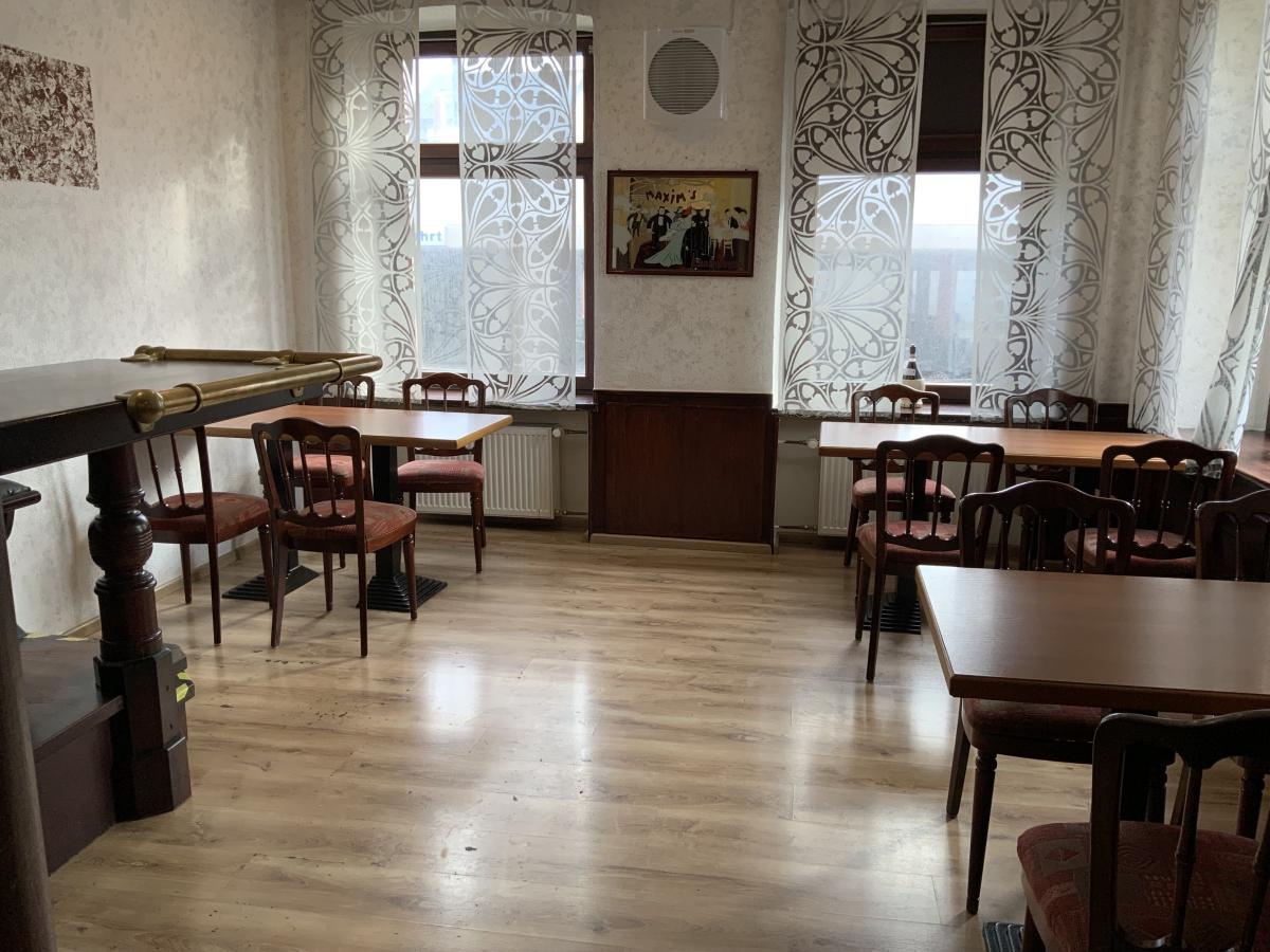 Im Erdgeschoss befindet sich ein ehemaliges Restaurant, das ebenfalls leer steht. Die Gewerbefläche eignet sich ideal zur Reaktivierung als Gastronomiebetrieb oder zur Umnutzung in andere gewerbliche Konzepte wie Büroflächen, Praxisräume oder Einzelhandel.