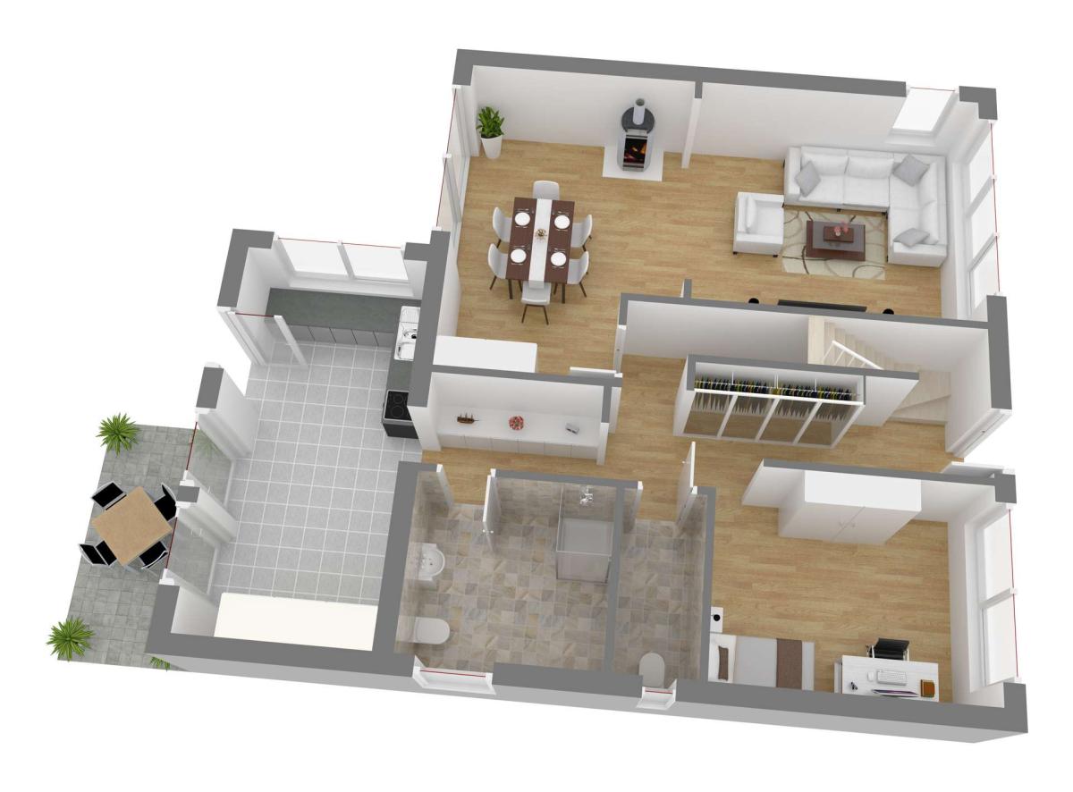 Die lichtdurchflutete Wohnküche mit heller Einbauzeile, freundlichen Bodenfliesen und genügend Platz für eine große Esstafel ist ein richtiger Wohlfühlort im Haus – perfekt für gemeinsame Mahlzeiten mit Familie und Freunden. Von hier gelangen Sie über gleich zwei Türen auf die überdachte Terrasse, die zum Verweilen einlädt. Eine weitere Tür mit Treppenabgang führt Sie direkt in den idyllischen Garten, wo ein praktischer Schuppen zusätzlichen Stauraum für Gartengeräte oder Fahrräder bereithält.