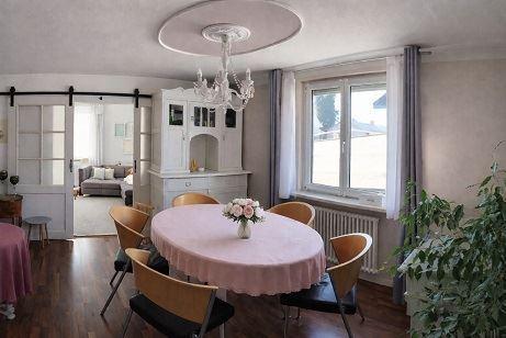 Esszimmer mit Laminatboden, Tapete und Edelputz;