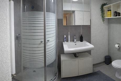 Duschbad mit Wand- und Bodenfliesen und Edelputz, ausgestattet mit Dusche, WC und Waschbecken;