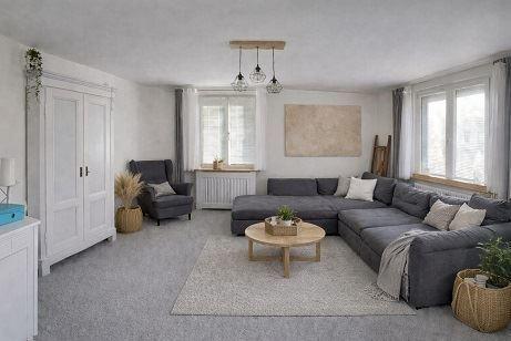 Wohnzimmer mit Teppichboden und Raufasertapete;