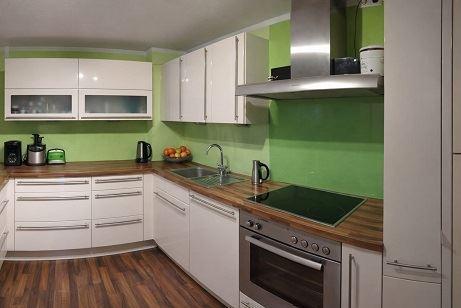 Küche mit Laminatboden und Raufasertapete;