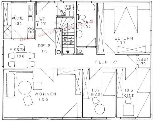 Erdgeschoss: Eingangsbereich, WC, Bad, Küche, Wohnzimmer, Schlafzimmer, Kinderzimmer, Büro / Gästezimmer sowie eine verglaste Terrasse / Wintergarten vor dem Wohnzimmer.