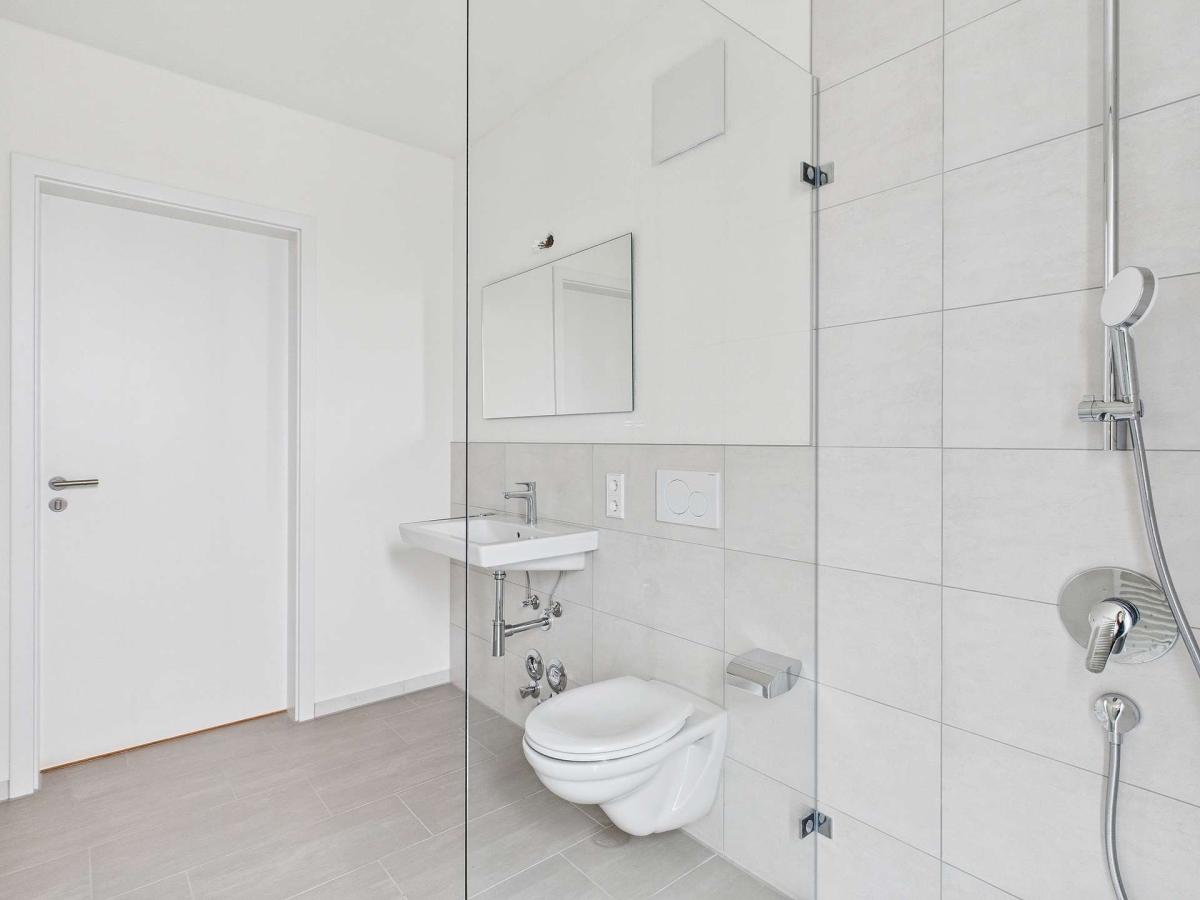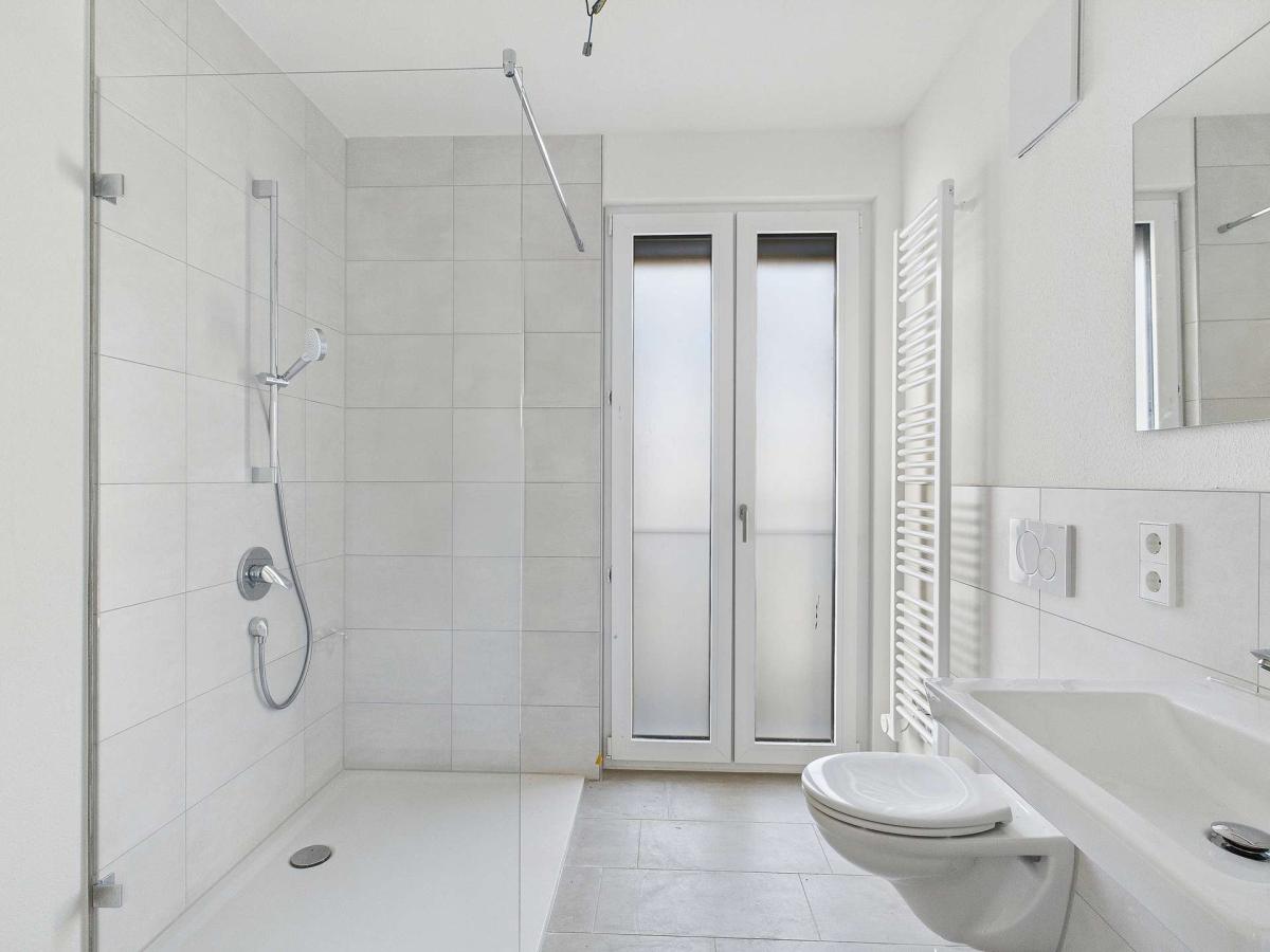 Ebenerdige Duschen, Handtuchheizkörper und große Wand- und Bodenfliesen sorgen nicht nur für ein tolles Design, sondern auch für einen modernen Wohnkomfort im Badezimmer.