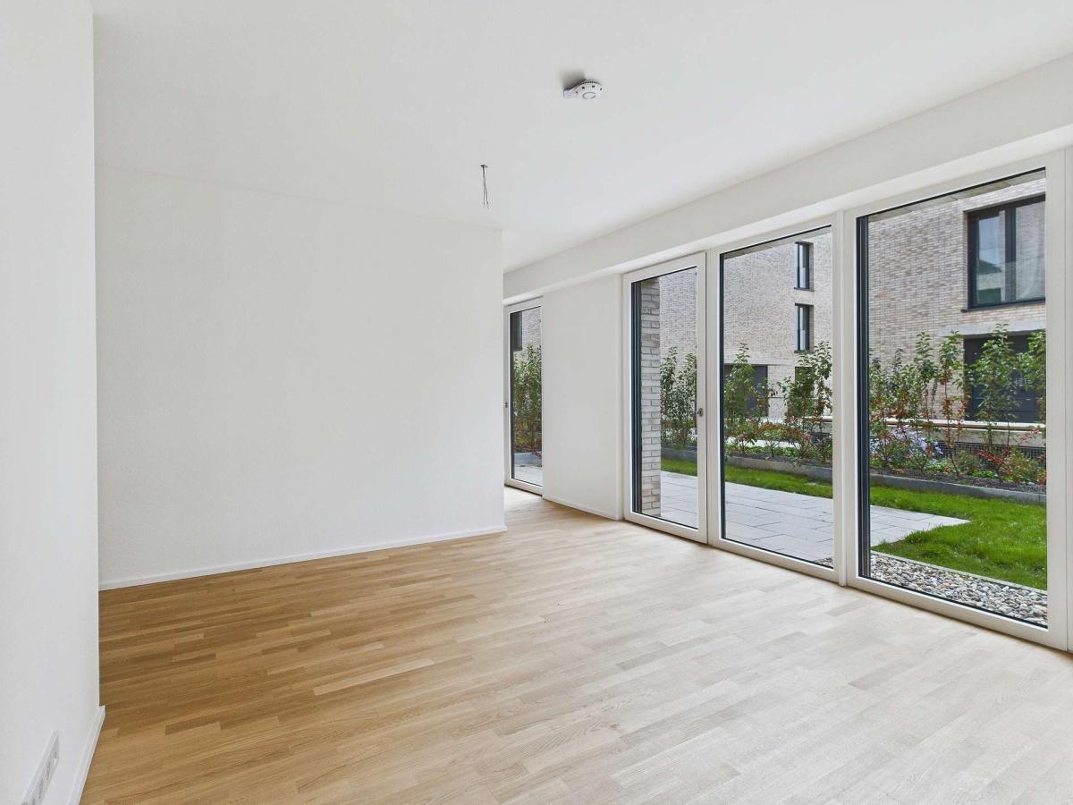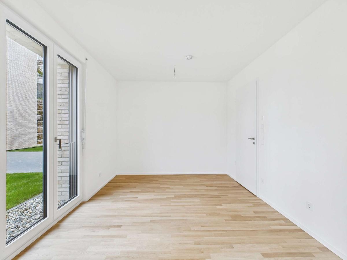 Dreifach verglaste, bodentiefe Kunststofffenster, sorgen für viel Licht, einen optimalen Energieverbrauch und eine optimale Lärmreduzierung in der urbanen Lage.