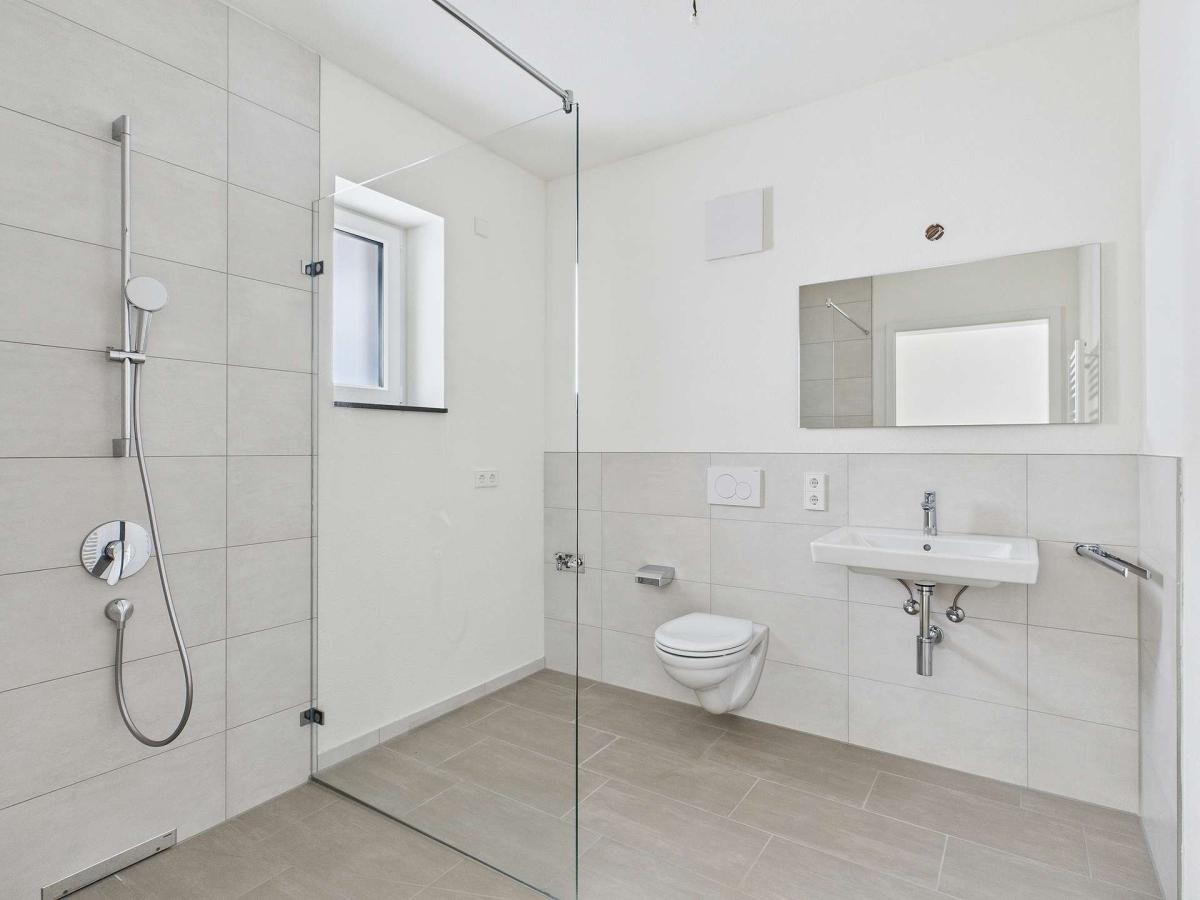 Ebenerdige Duschen, Handtuchheizkörper und große Wand- und Bodenfliesen sorgen nicht nur für ein tolles Design, sondern auch für einen modernen Wohnkomfort im Badezimmer.