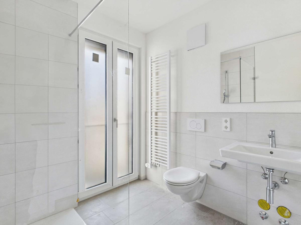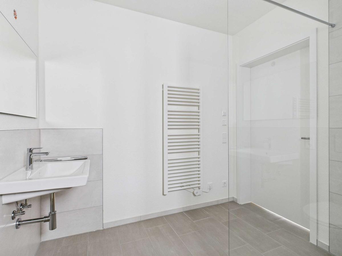 Ebenerdige Duschen, Handtuchheizkörper und große Wand- und Bodenfliesen sorgen nicht nur für ein tolles Design, sondern auch für einen modernen Wohnkomfort im Badezimmer.