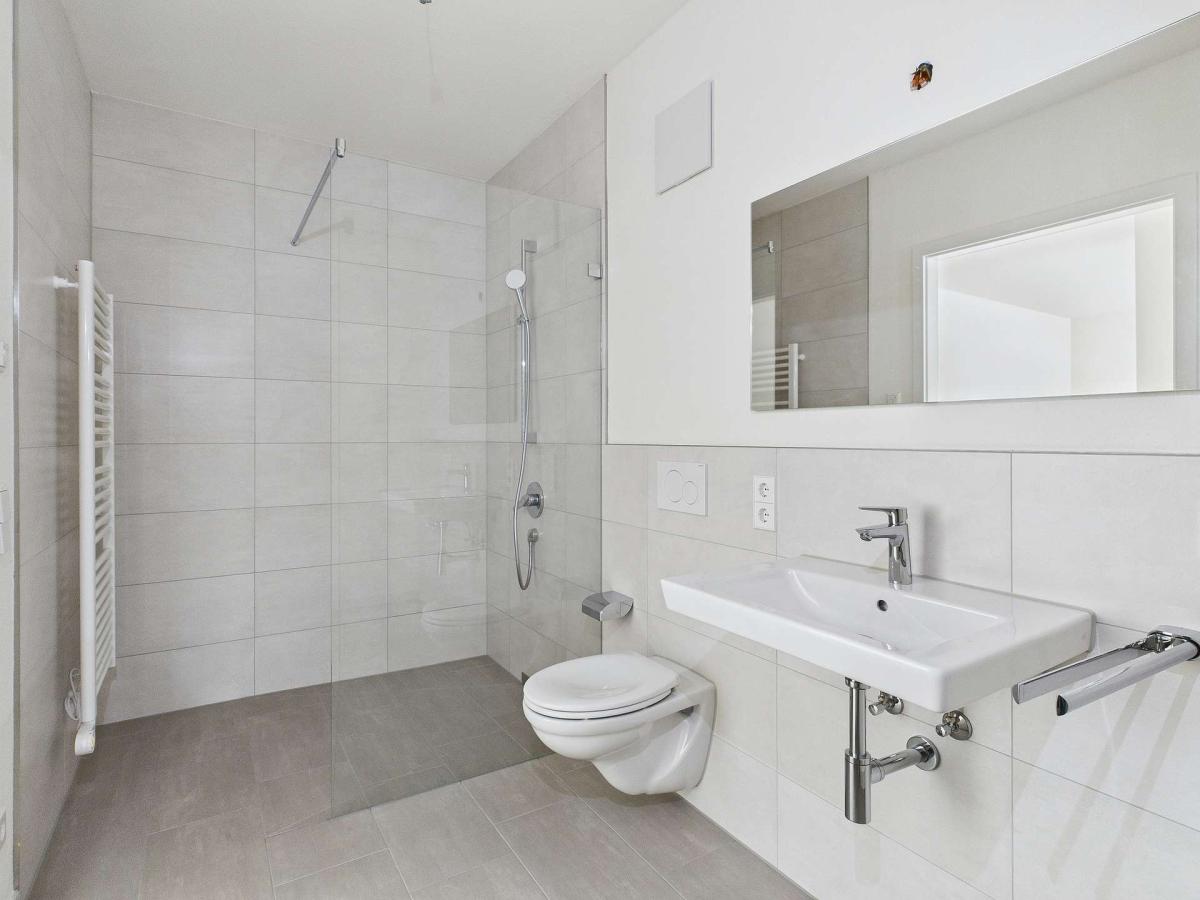 Ebenerdige Duschen, Handtuchheizkörper und große Wand- und Bodenfliesen sorgen nicht nur für ein tolles Design, sondern auch für einen modernen Wohnkomfort im Badezimmer.