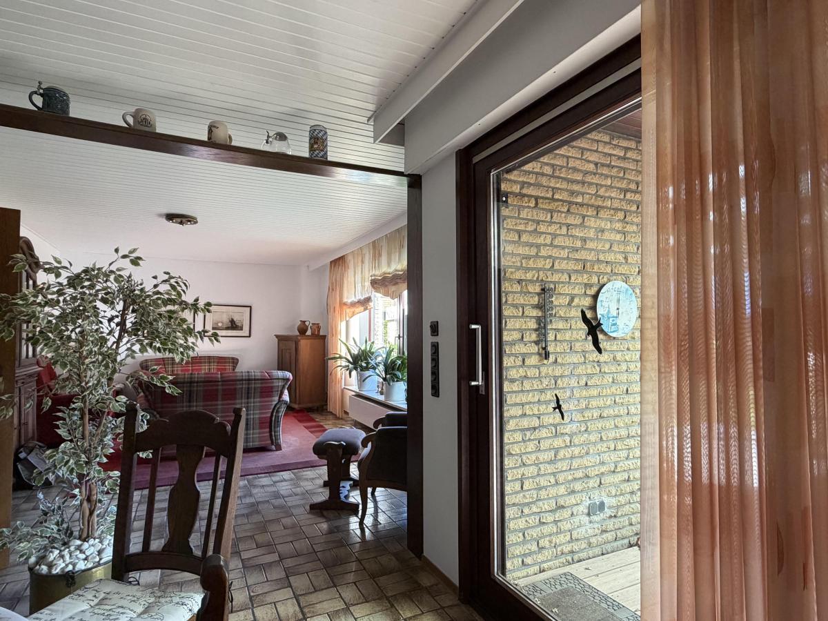 Der helle Wohn- und Essbereich bildet das Herzstück des Hauses und ermöglicht durch große Fensterflächen einen schönen Blick in den Garten. Von hier aus gelangen Sie direkt auf die sonnige, überdachte Terrasse, die zum Entspannen und Verweilen einlädt. Der gepflegte Garten bietet ausreichend Platz für individuelle Gestaltungsmöglichkeiten.