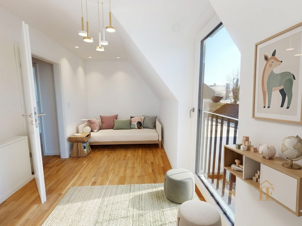 Das Obergeschoss bietet den privaten Rückzugsbereich der Familie mit zwei hellen Kinderzimmern, einem großzügigen Elternschlafzimmer sowie einem stilvollen Badezimmer mit Badewanne und Doppelwaschbecken.
