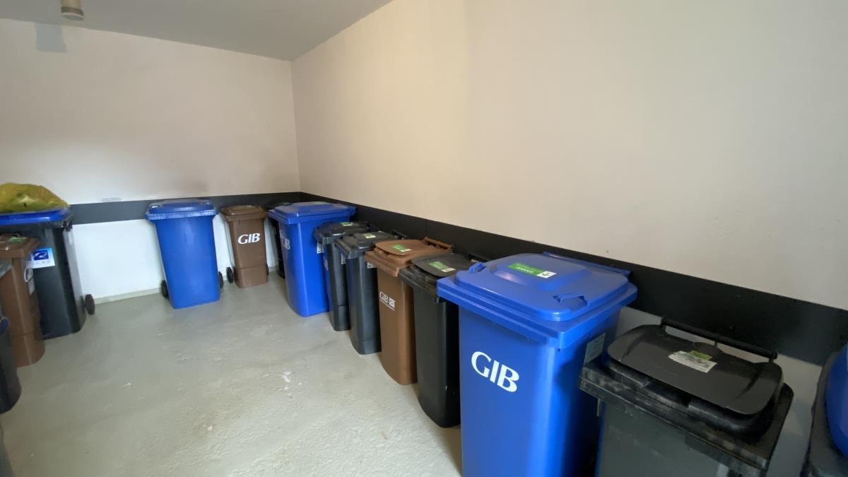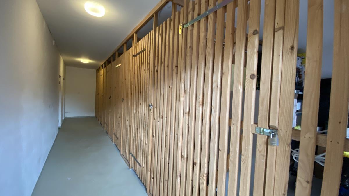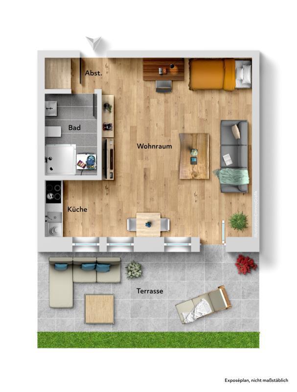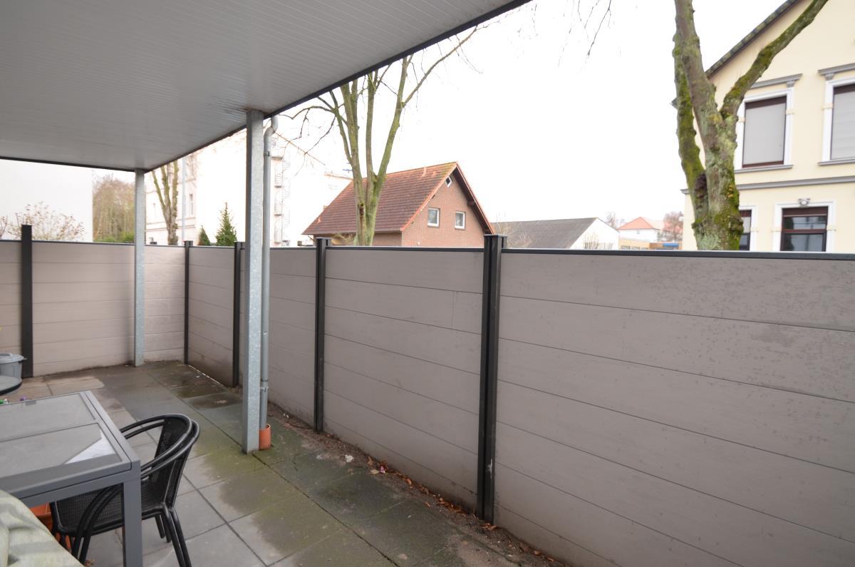 Zur Wohnung gehört ein großzügiger Terrassenbereich, der durch einen Sichtschutz vor Blicken geschützt ist. Zudem gibt es ein Nebengebäude mit separatem Abstellraum. Auch die Mülltonnen sind dort unauffällig untergebracht. Eine Garage im Nachbargebäude gehört ebenfalls dazu.