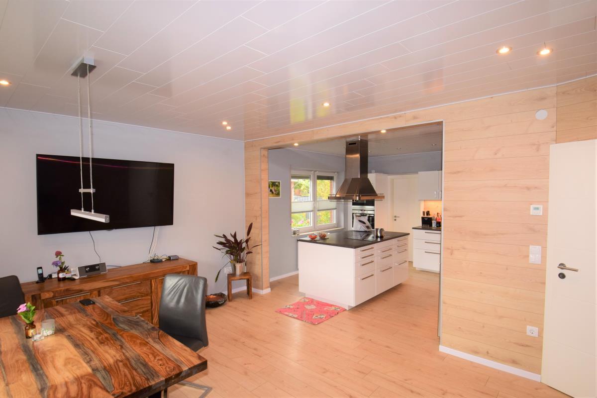 Im Erdgeschoss befinden sich neben dem Bad und WC der Hauswirtschaftsraum, ein Schlafzimmer und die großzügige Kombination aus Esszimmer und Küche. Praktisch ist der Vorratsraum, der an die Küche direkt angegliedert ist. Ein Glanzlicht ist der Wintergarten, der sich durch seine Bauart von herkömmlichen Wintergärten sehr unterscheidet, dadurch ganzjährig als Wohnraumerweiterung genutzt werden kann. Der hier installierte Kaminofen kann die Beheizung unterstützen, ein weiterer Ofen befindet sich im Esszimmer. Der Wintergarten verfügt durch einen Zwischenraum über einen Zugang zur Garage. Ebenfalls hier ist eine Treppe installiert, über die der Dachboden der Garage erreicht werden kann, dessen rund 20 m² Fläche z.B. als Hobby- oder Sportfläche dienen können.