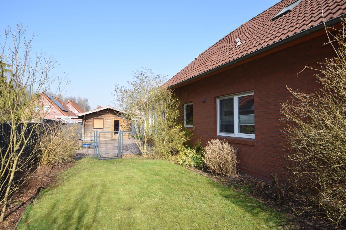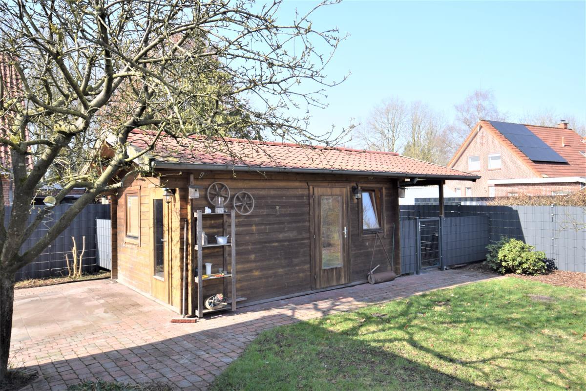 Im Außenbereich steht neben der Garage ein großes Blockhaus (4x5m) zur Verfügung. Der Garten besteht überwiegend aus Rasenfläche und ist pflegeleicht angelegt.