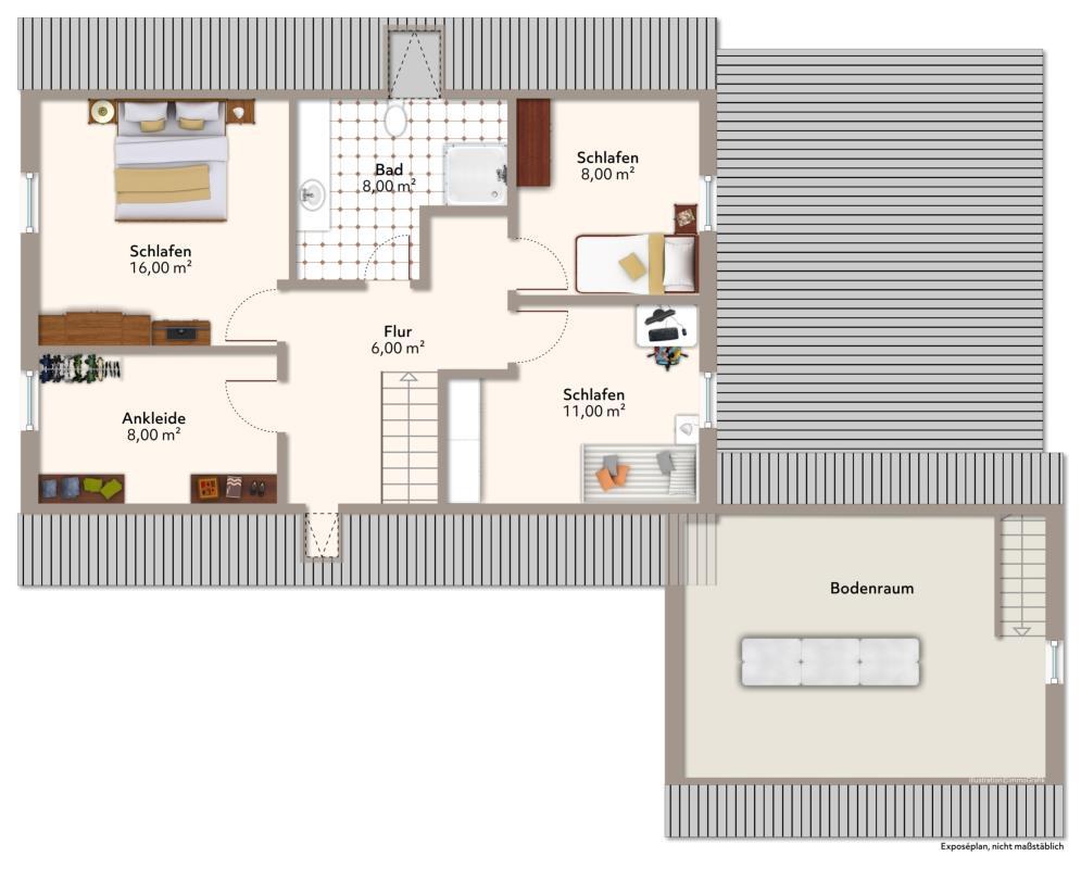Das ausgebaute Dachgeschoss beherbergt vier weitere Räume und ein zusätzliches Duschbad, ideal als separater Kinderbereich.