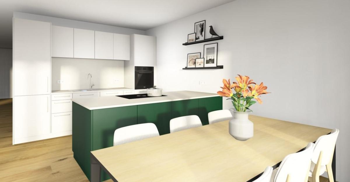 Helles Wohn- und Esszimmer mit offener Küche. Hier erwartet Sie eine neue und topmoderne Einbauküche mit Kochinsel.