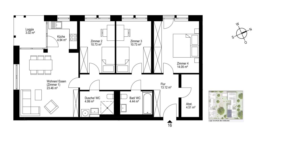- Jede Wohnung mit privatem Außenbereich: Terrassen im Erdgeschoss, Loggien in den Obergeschossen