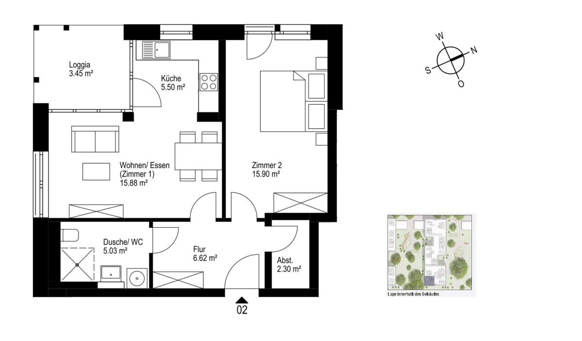 - Jede Wohnung mit privatem Außenbereich: Terrassen im Erdgeschoss, Loggien in den Obergeschossen