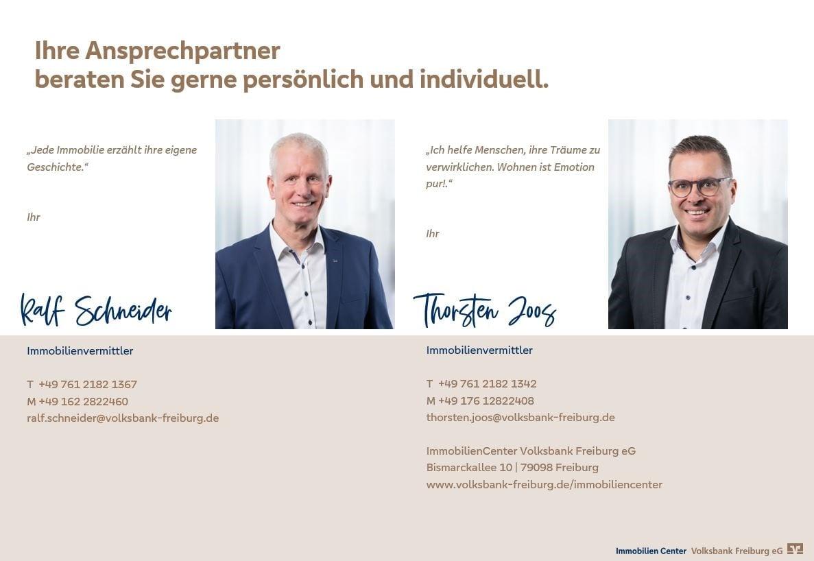 Die Angaben im Exposé stammen ausschließlich vom Bauträger. Eine Gewährleistung für die darin enthaltenen Angaben kann seitens der Volksbank Freiburg eG nicht übernommen werden. Insbesondere wird darauf hingewiesen, dass sich die Tätigkeit der Volksbank Freiburg eG auf den bloßen Immobilienvertrieb beschränkt, im Falle eines Erwerbs von Eigentum zu Anlagezwecken ist mit der Vermittlung der Wohnung keine Anlagenberatung verbunden, dass Immobiliencenter der Volksbank Freiburg eG hat die Ertragsmöglichkeiten und insbesondere auch die steuerlichen Möglichkeiten in diesem Zusammenhang nicht geprüft und kann hierfür keine Haftung übernehmen.
