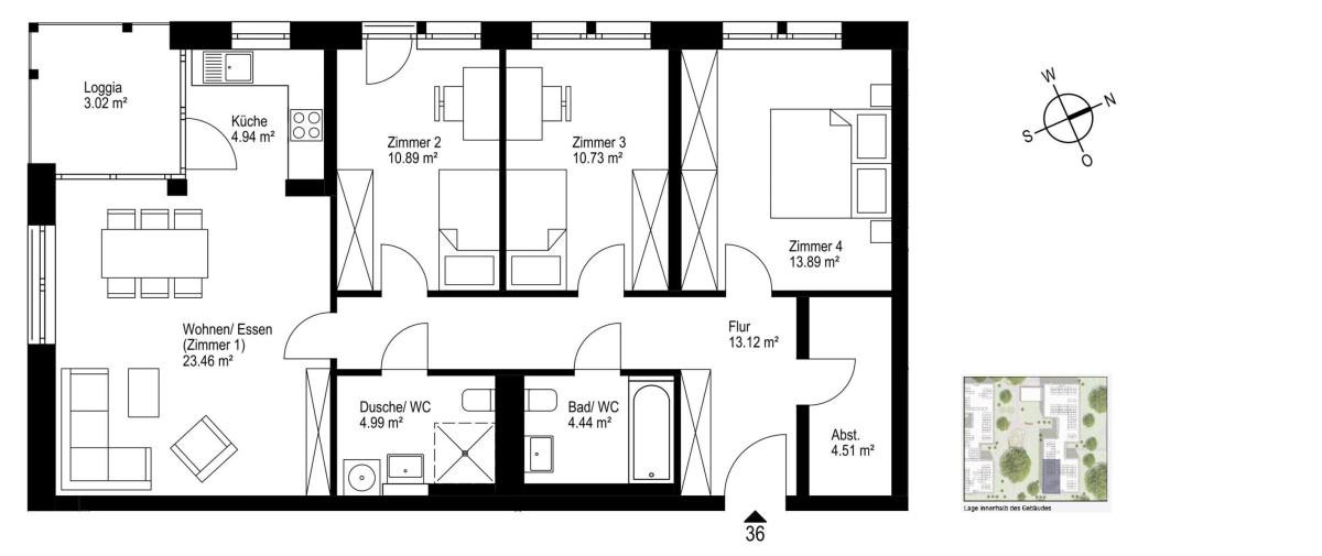 - Jede Wohnung mit privatem Außenbereich: Terrassen im Erdgeschoss, Loggien in den Obergeschossen