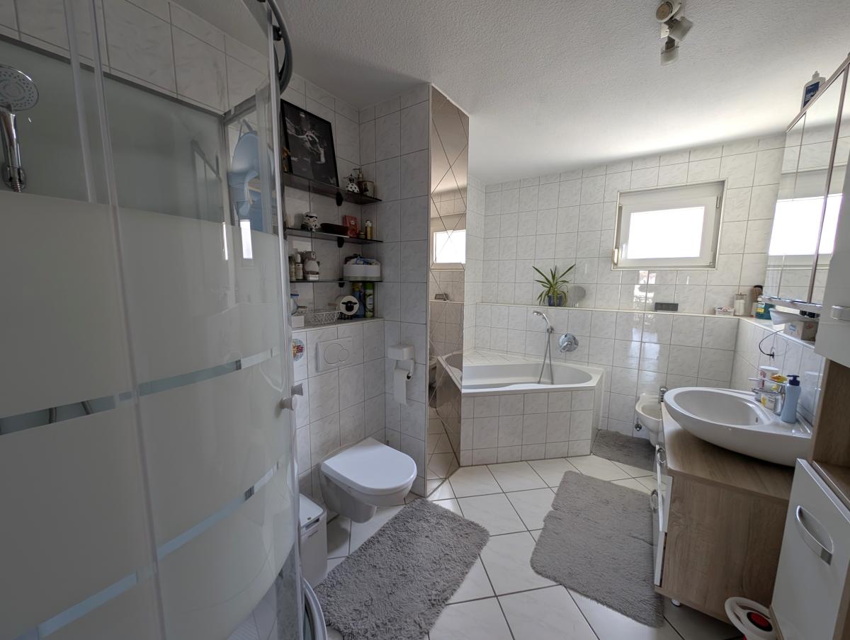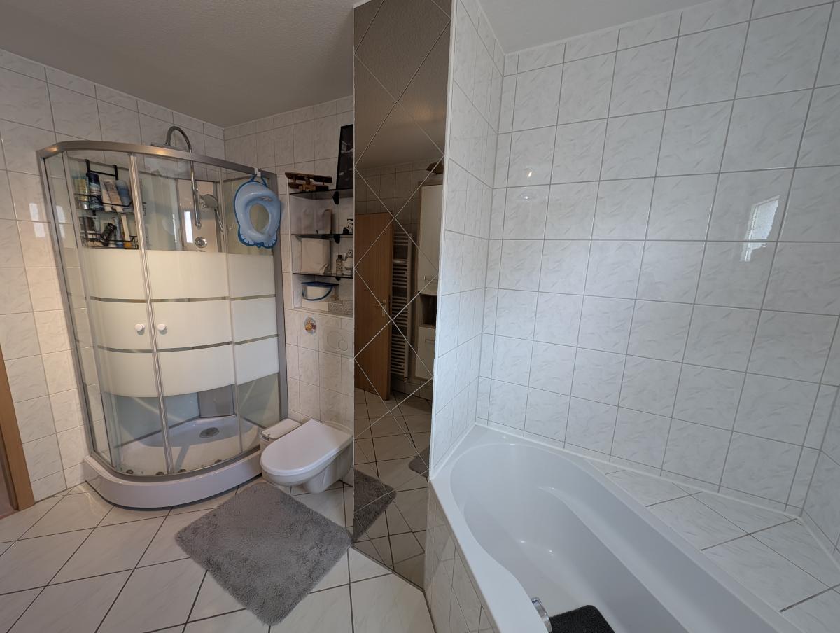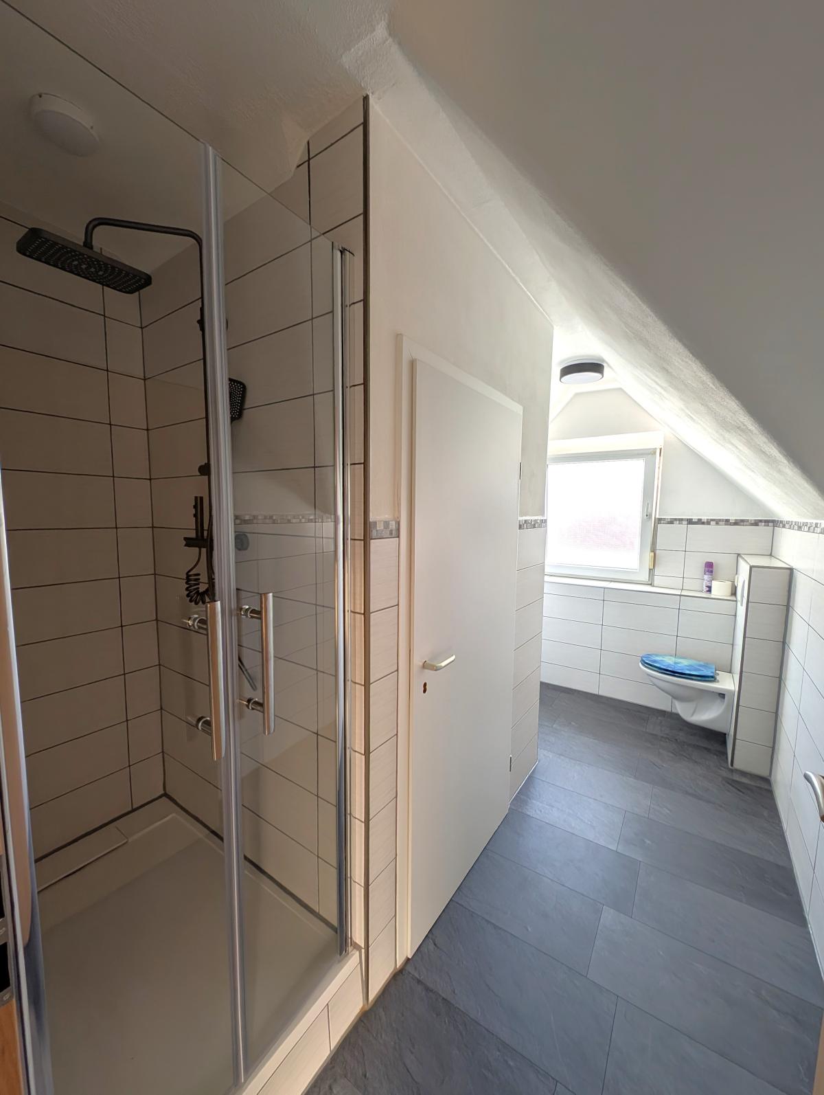 Im Obergeschoss erwartet Sie ein hell gefliestes Tageslichtbad in zeitlos moderner Optik mit Dusche, Badewanne, Bidet, WC und Waschtisch – ein Ort zum Wohlfühlen. Das Dachgeschoss beherbergt ein weiteres, im Jahr 2025 neu gestaltetes Tageslichtbad mit Dusche, WC und Waschtisch. Große Dachflächenfenster sorgen hier für ein besonders angenehmes Lichtambiente.