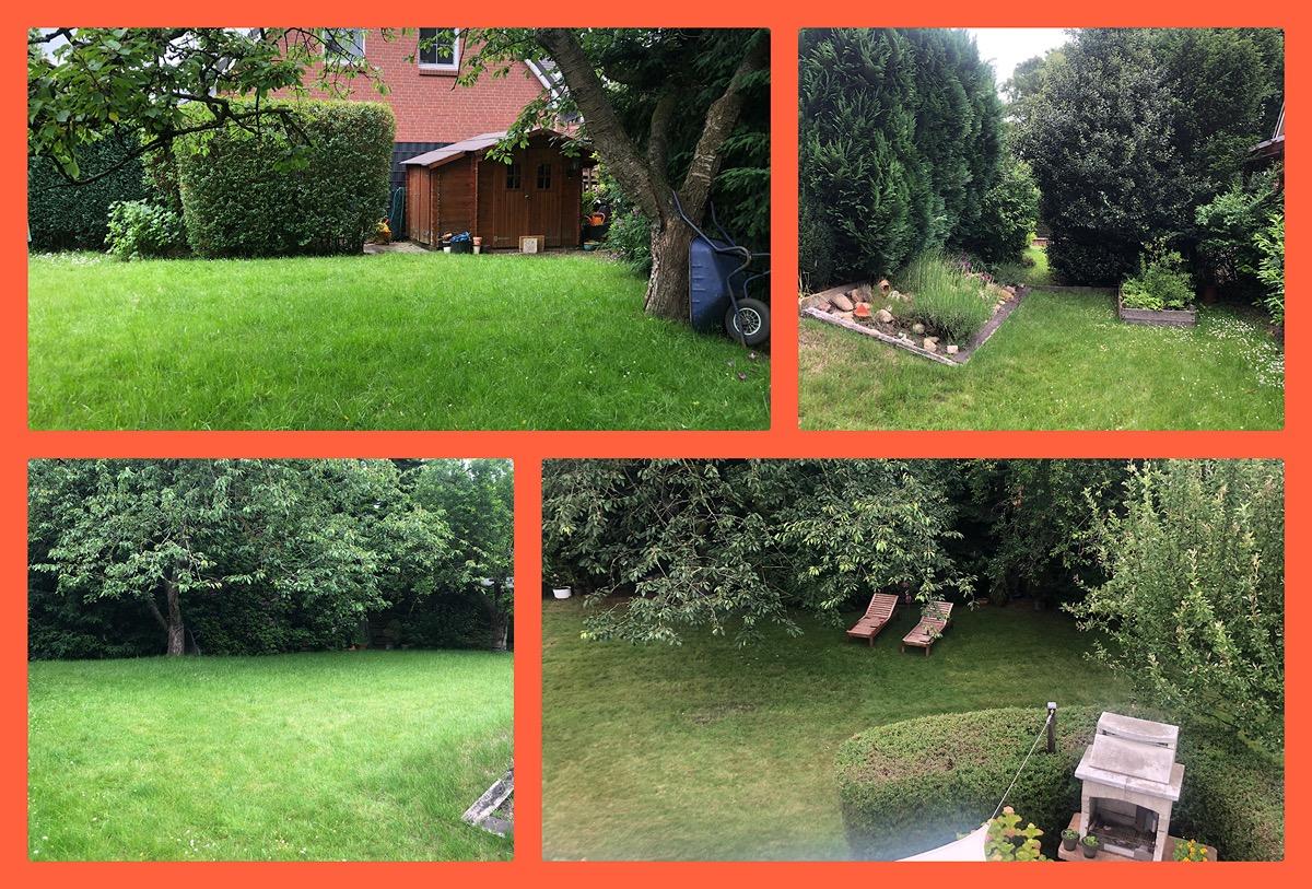Großzügiger, gepflegter Garten mit Gartenhäuschen und verschiedenen Obstbäumen