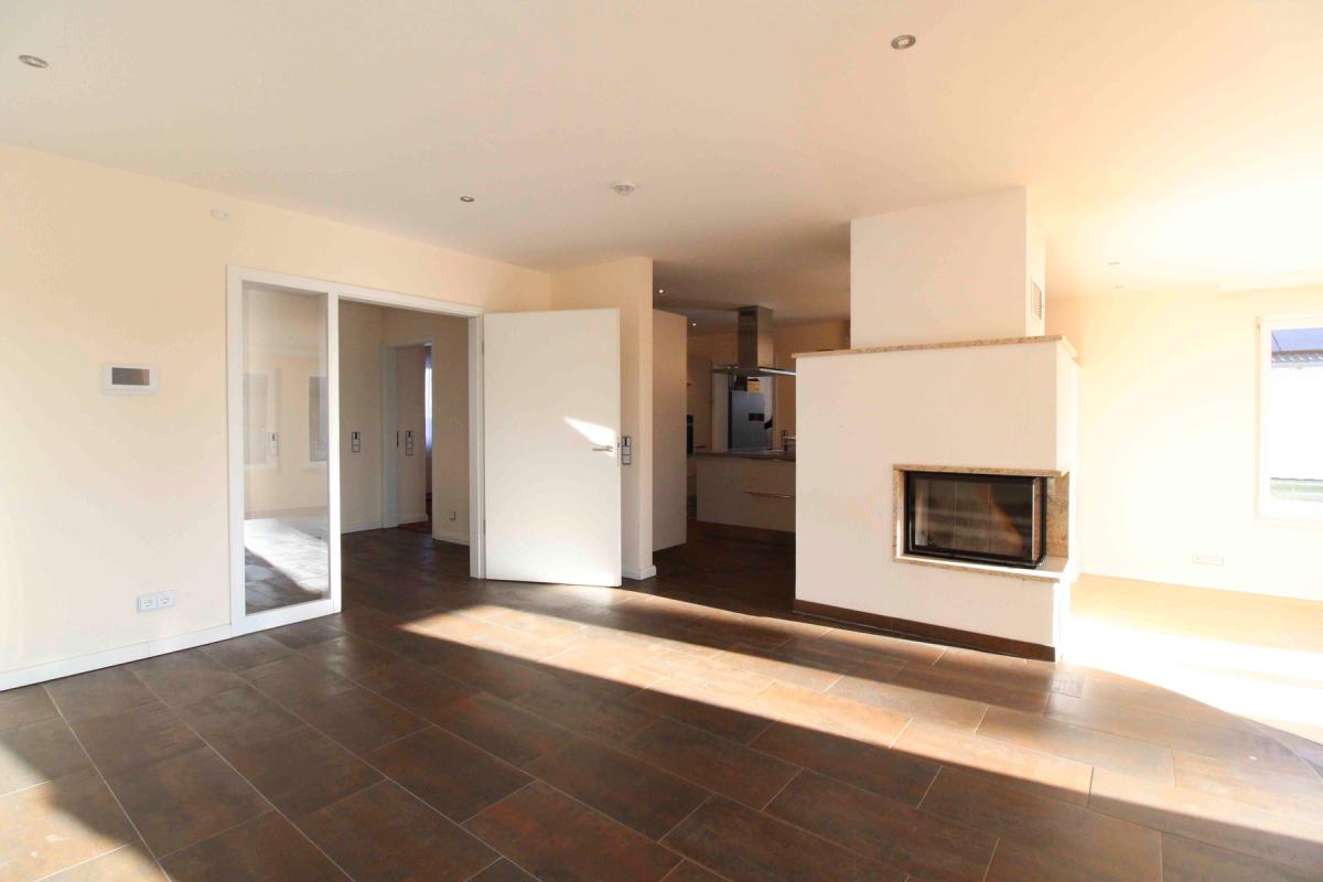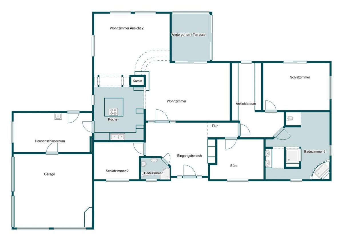 Herzstück des Hauses ist der offen gestaltete Wohn-, Ess- und Kochbereich, der trotz seiner Großzügigkeit charmant in einzelne Zonen gegliedert ist. Ein zentral platzierter Kamin sorgt für zusätzliche Wärme und unterstreicht die wohnliche Atmosphäre, während große Fensterflächen Innen- und Außenbereich harmonisch verbinden. Der Wintergarten mit vollständig zu öffnenden Glasschiebetüren lässt sich in eine überdachte Terrasse verwandeln und erweitert den Wohnraum ideal ins Grüne.