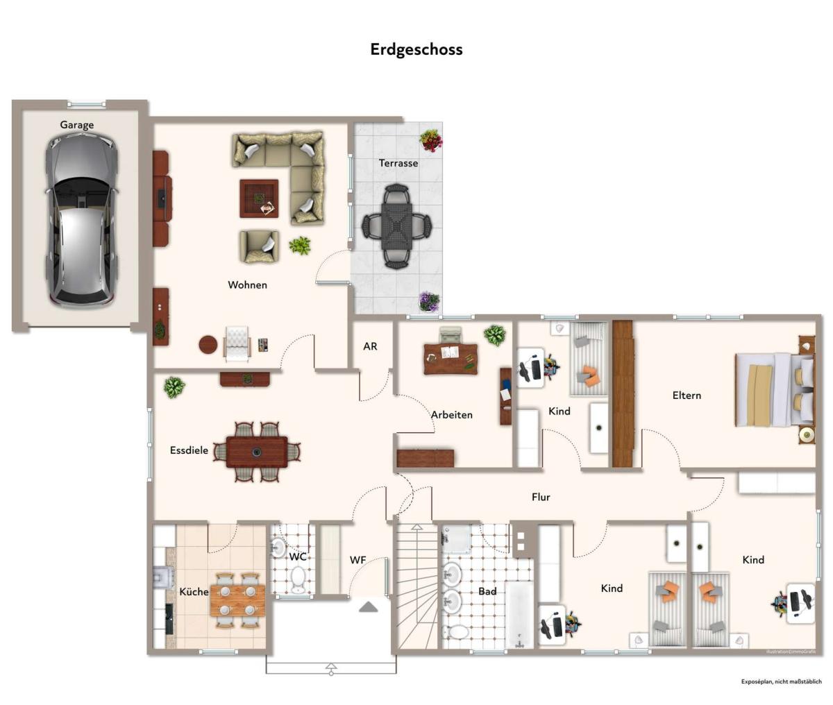Mit einer Wohnfläche von ca. 144 m² und insgesamt 6 Zimmern bietet das Haus ein großzügiges Raumangebot. Die intelligente Aufteilung sorgt für vielfältige Nutzungsmöglichkeiten – ob für Familien mit Kindern, Paare mit Platzbedarf oder die Kombination von Wohnen und Arbeiten unter einem Dach.