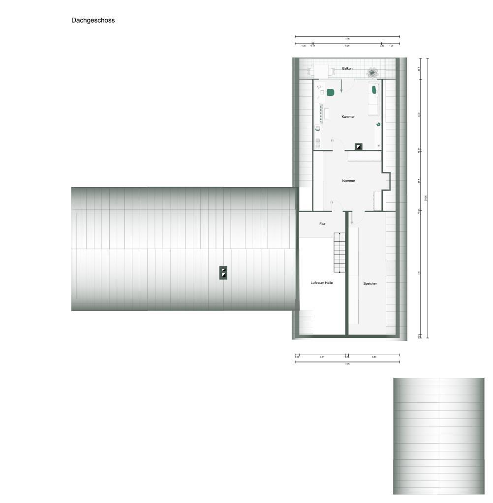 Im Dachgeschoss liegen 2 hintereinander angeordnete Zimmer, daran anschließend ein nach Westen ausgerichteter Balkon. Außerdem gibt es im Obergeschoss einen großzügigen Abstellraum.