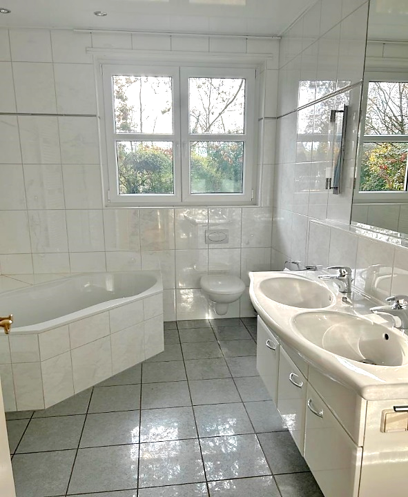 Sanitärausstattung: Bäder mit Badewanne, Duschwanne oder Bidet, 2 Waschbecken und Klosett.