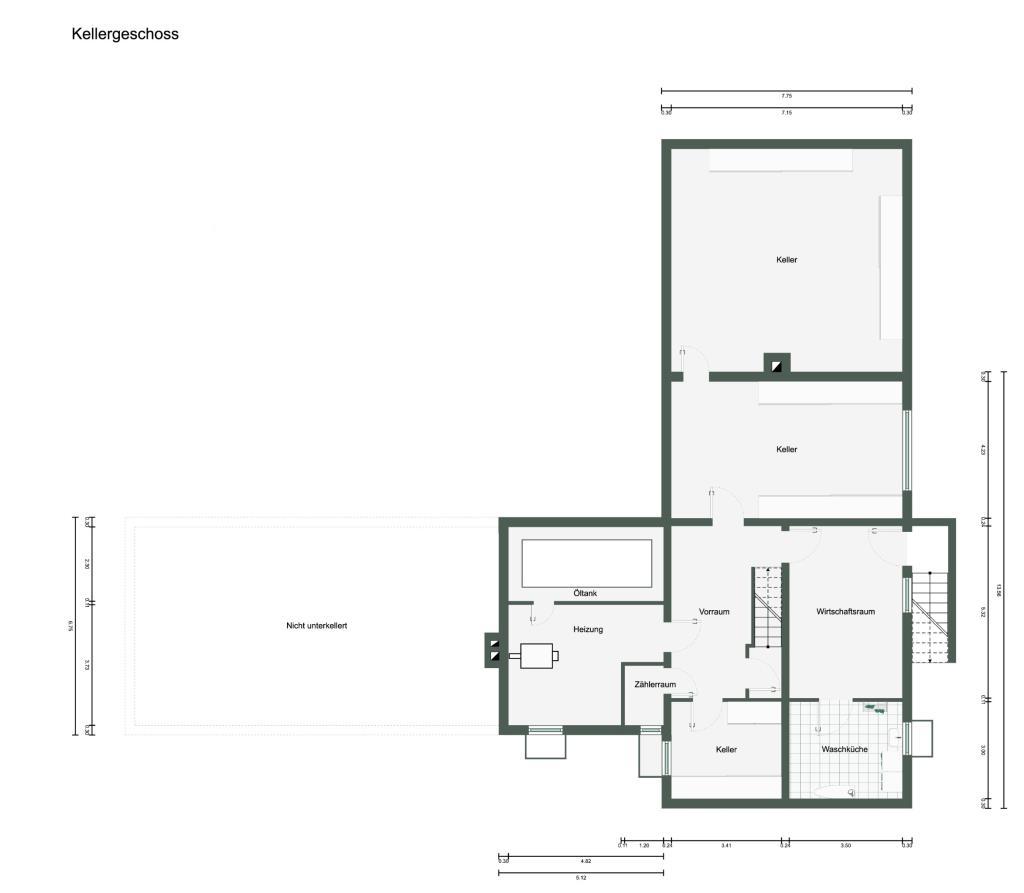 Das Kellergeschoss besteht neben den Technikräumen aus 5 Kellerräumen, von denen die größeren über Tageslicht verfügen, da das Gelände auf der Nordseite abgeböscht wurde. Eine Außentreppe führt direkt vom Keller in den Garten.