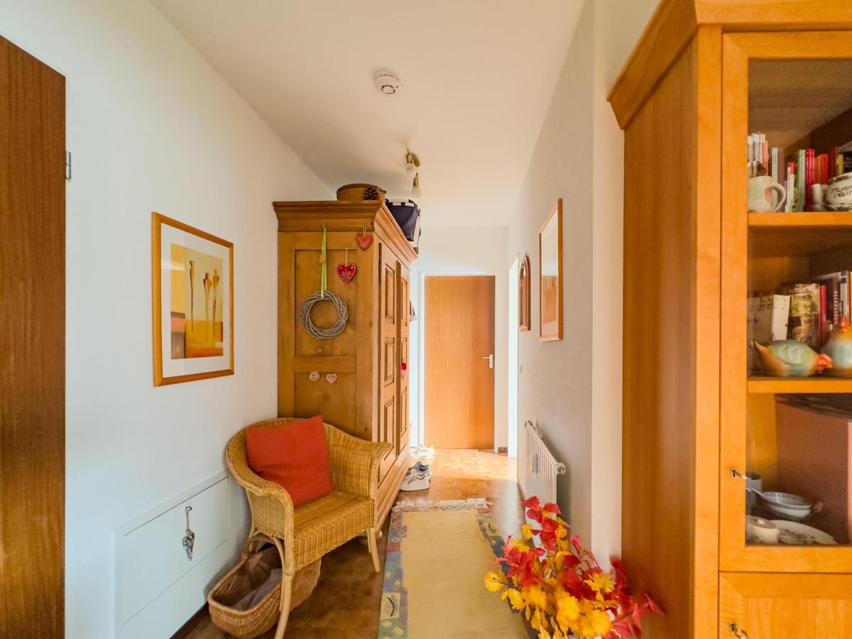 Ein zentraler Flur im Eingang verschafft Zugang zu allen Bereichen der Wohnung und sorgt für eine klare Struktur. Das helle Schlafzimmer bietet ausreichend Platz für ein Doppelbett und einen Kleiderschrank. Das Badezimmer ist mit einer Dusche, einer Badewanne sowie einem WC ausgestattet – zusätzlich steht ein separates Gäste-WC zur Verfügung. Im Küchenbereich findet eine Einbauküche mit Vollausstattung problemlos Platz. Ein wahres Highlight ist der Wohn-/Essbereich - durch die große Fensterfront entsteht ein freundliches und helles Wohnambiente. Der angrenzende Südbalkon lädt an sonnigen Tagen zum Entspannen und Verweilen ein.