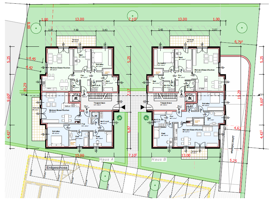 Für das angebotene Grundstück in zweiter Reihe mit einer Größe von ca. 1.540 m² liegt ein rechtskräftiger vorhabenbezogener Bebauungsplan vor. Geplant sind zwei Mehrfamilienhäuser mit einer Gesamtwohnfläche von ca. 1.040 m², verteilt auf insgesamt 10 Wohneinheiten.