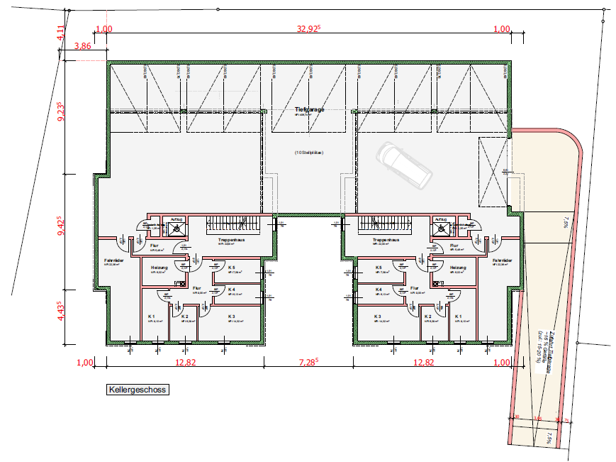 Ebenfalls in der Tiefgarage sind neben Stellplätzen auch einzelne Abstellräume für die Wohnungen vorgesehen, sowie Fläche für Technik und Fahrradeistellplätze.