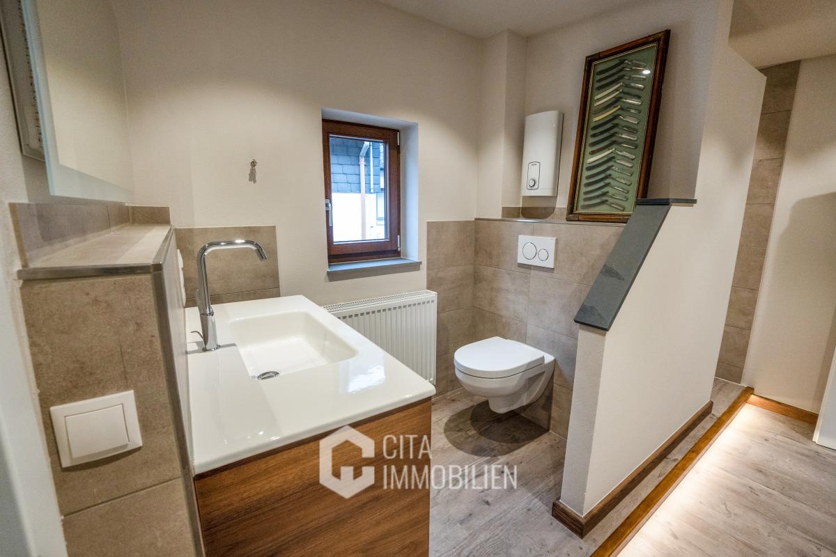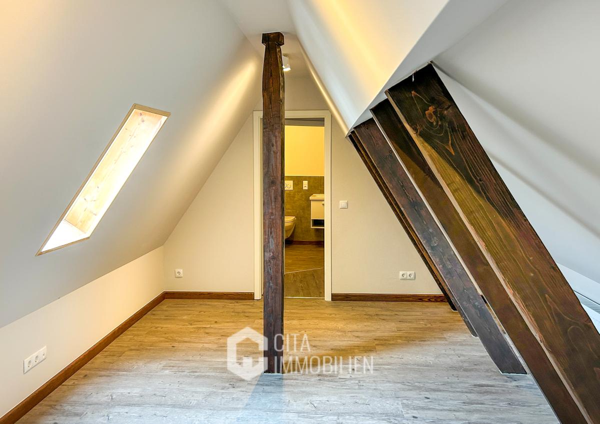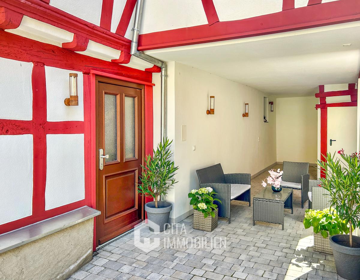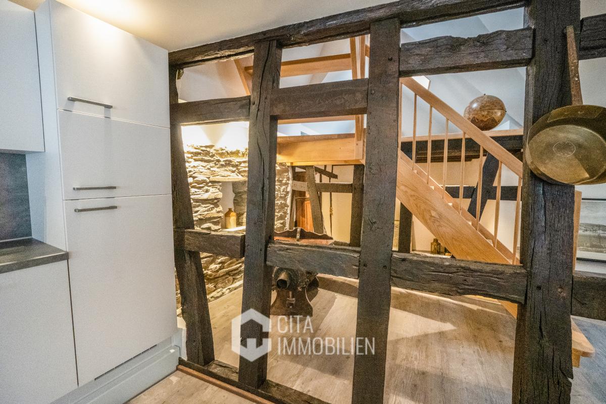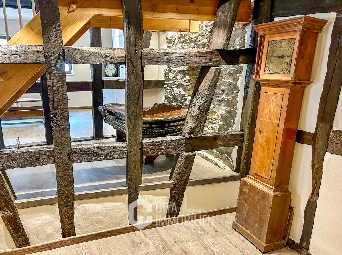 Die solide historische Bausubstanz wurde behutsam erhalten und gezielt ergänzt. Charakteristische Elemente wie offen gelegte Holzbalken, freigelegte Bruchsteinmauern und die typische Fachwerkkonstruktion prägen das Erscheinungsbild und verleihen dem Haus seine unverwechselbare Identität. Gleichzeitig sorgt die durchdachte Neugestaltung der Grundrisse für helle Räume, moderne Wohnqualität und angenehm hohe Decken, was bei historischen Fachwerkhäusern keine Selbstverständlichkeit ist.