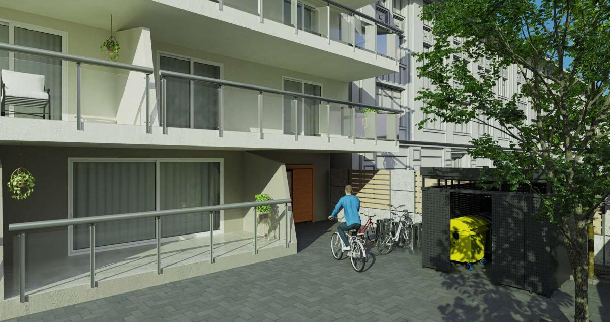 Es handelt sich bei der Abbildung nicht um ein Bestandsgebäude, sondern um ein Baugrundstück mit erteilter Baugenehmigung für das dargestellte Mehrfamilienhaus.