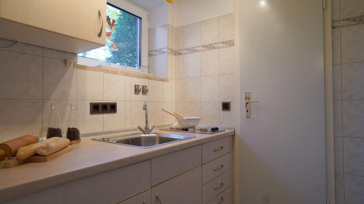 - Helle Einbauküche mit Elektrogeräten und kleiner Abstellkammer