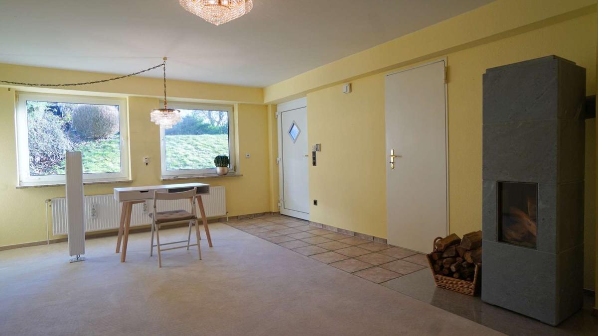 - Zimmer (ca. 50 m²; Deckenhöhe ca. 2,30 m) mit Kaminofen und elektrischen Außenrollläden