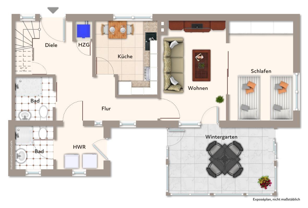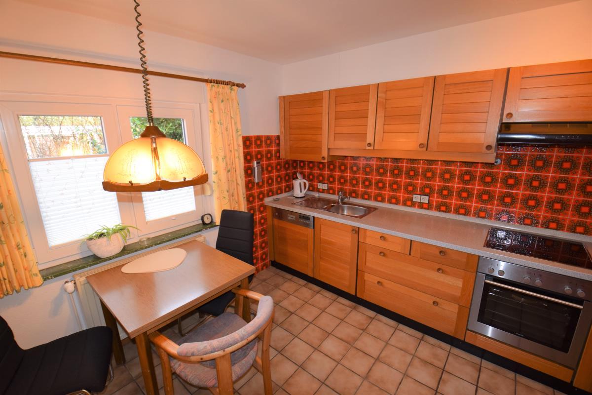 Im Erdgeschoss des Hauses befinden sich neben den beiden Badezimmern der Hauswirtschaftsraum, die Küche und das Wohnzimmer. Der hintere Teil dieses Raumes wurde abgetrennt und mit einer Schiebetür versehen, um ein Erdgeschossschlafzimmer zu realisieren. Selbstverständlich ist alternativ die Nutzung als großes Wohnzimmer möglich.