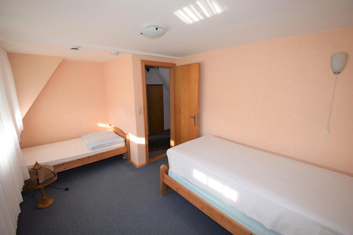 Das Dachgeschoss beherbergt ein weiteres Duschbad, ein Kinderzimmer, einen Durchgangsraum (Spielzimmer/Büro) und ein weiteres Schlafzimmer. Eine Neuaufteilung der Räume ist auf dieser Etage aufgrund der Leichtbauweise denkbar.