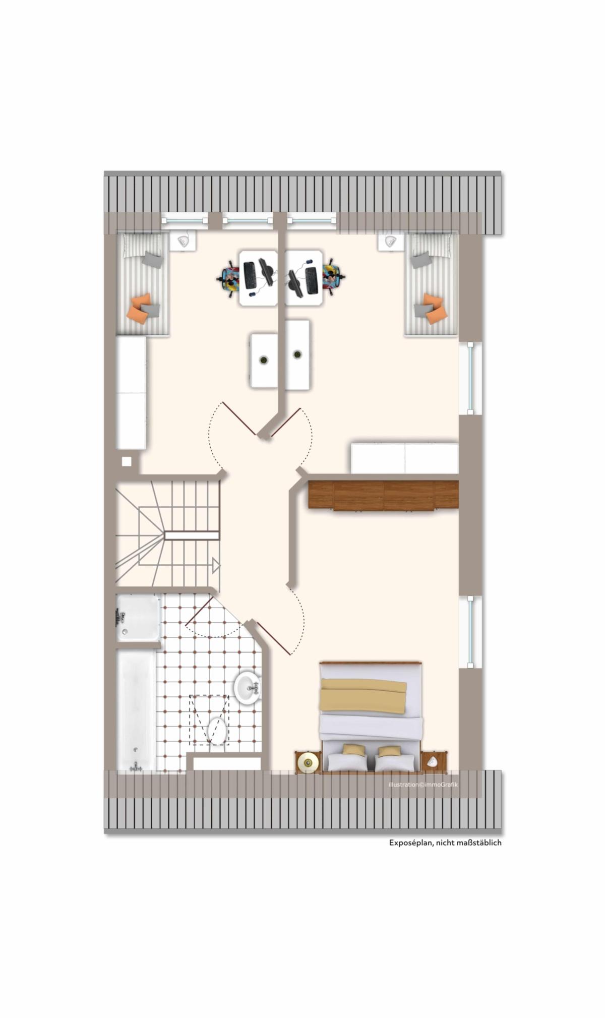 Im Dachgeschoss erwarten Sie ein Vollbad und drei Schlafzimmer. Der Bodenraum bietet zusätzliche Staufläche. Die Wohnküche und das Badezimmer sind mit einer Fußbodenerwärmung ausgestattet. Alle Fenster sind dreifach verglast. Die Jalousien im Wohnbereich werden elektrisch betrieben.