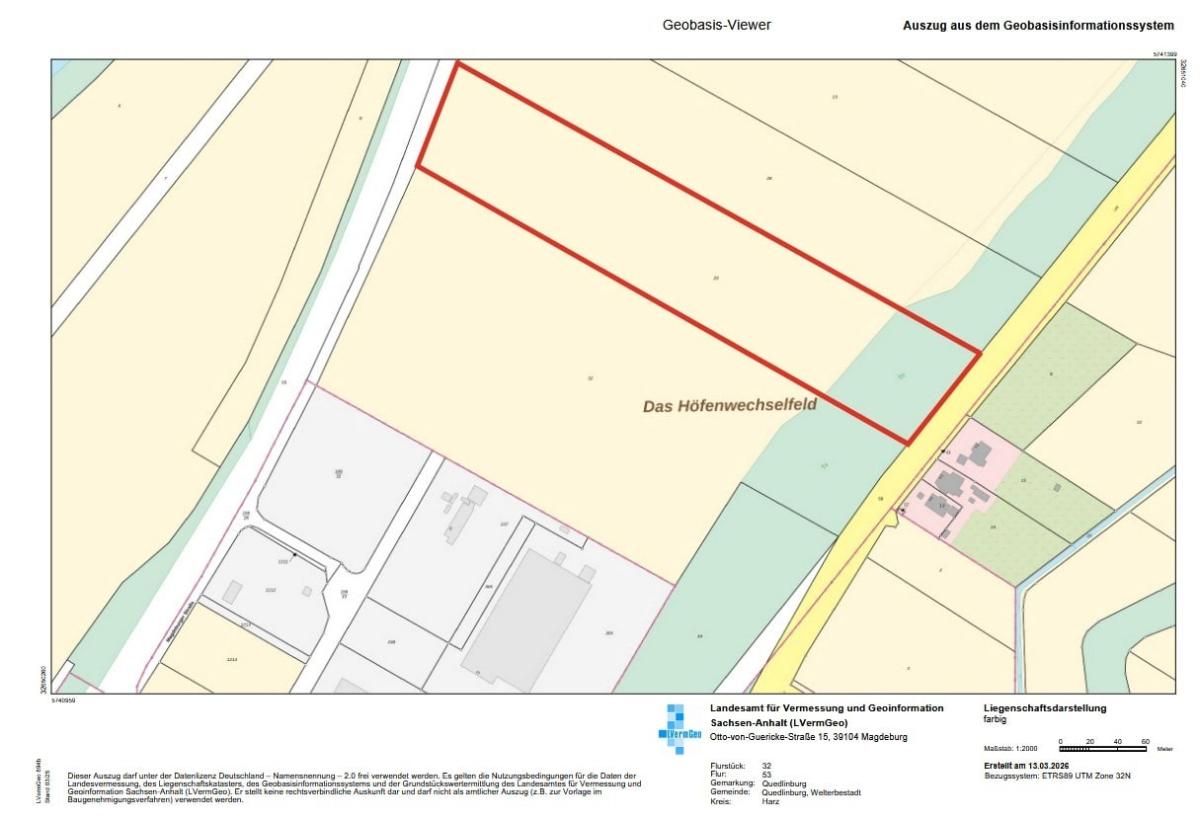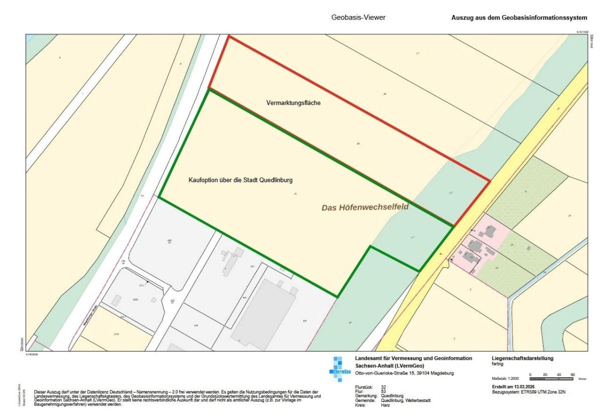 Zum Verkauf steht ein Gewerbegrundstück (Flur 53, Flurstück 29) mit einer Grundstücksfläche von ca. 30.939 m² im Nordöstlichen Stadtgebiet von Quedlinburg, im Industrie- und Gewerbegebiet „Magdeburger Straße“. Der Kaufpreis für das Grundstück beträgt 19,36€ / m². Zusätzlich besteht die Möglichkeit das südlich angrenzende Flurstück (Flur 53, Flurstück 32) mit ca. 55.680 m² von der Stadt Quedlinburg mitzuerwerben. (Ebenso möglich wäre auch nur ein Teilerwerb). Aktuelle Verhandlungsbasis ist der Bodenrichtwert von 10,00 € / m².