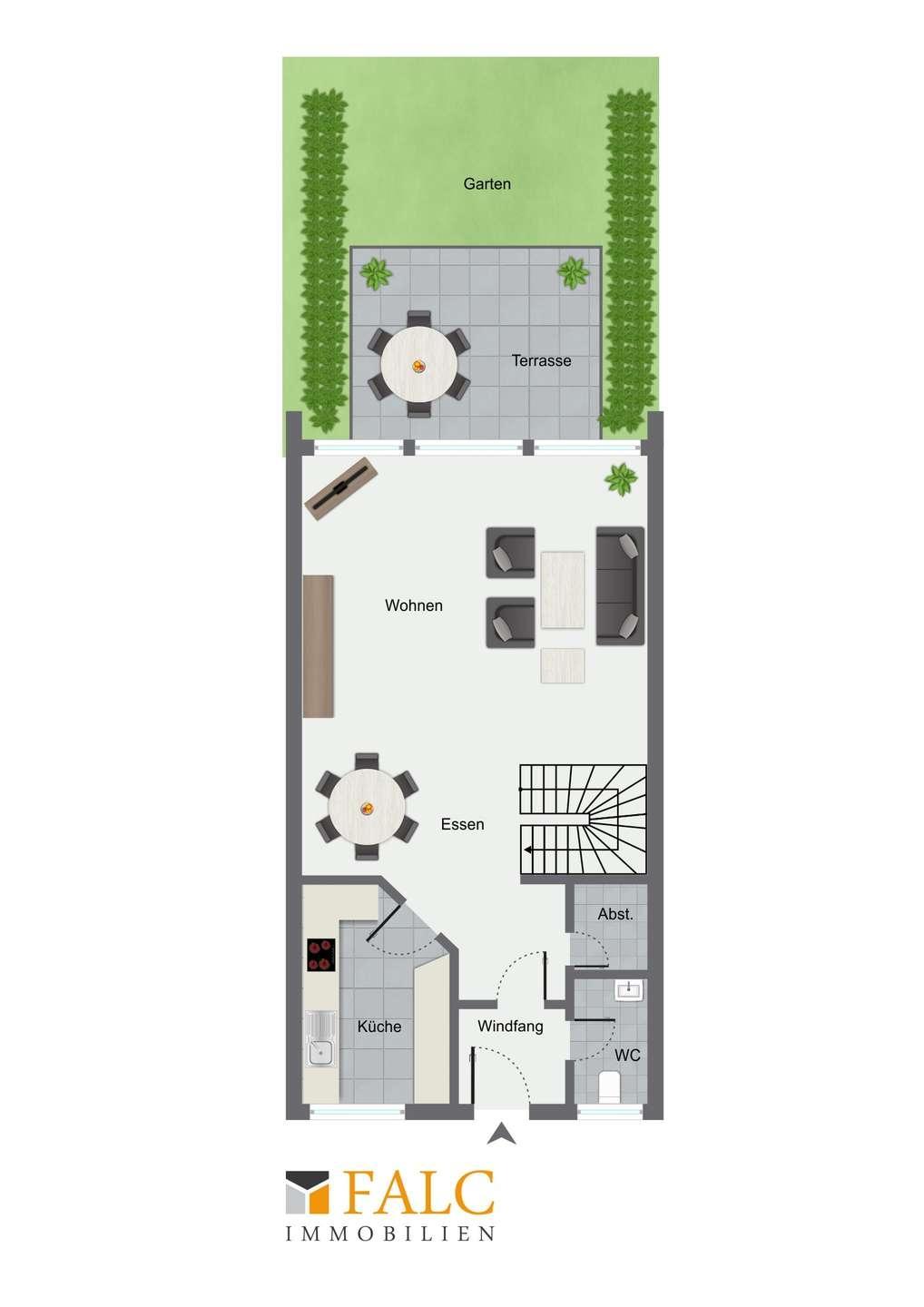 Bereits beim Betreten des Hauses über die 2025 vollständig erneuerte Veranda inklusive Treppenaufgang spüren Sie die angenehme Wohnatmosphäre. Auch das Vordach wurde erst 2018 modernisiert und unterstreicht den gepflegten Gesamteindruck der Immobilie. Das Erdgeschoss überzeugt mit einer durchdachten Aufteilung: Neben einem Gäste-WC und einem praktischen Abstellraum bildet der helle Wohn- und Essbereich gemeinsam mit der funktionalen Küche das Herzstück des Hauses. Von hier aus gelangen Sie direkt auf die sonnige Terrasse und in den pflegeleichten Südwestgarten – ideal für entspannte Tage, spielende Kinder oder gesellige Abende mit Familie und Freunden bei Sonne bis in die Abendstunden.