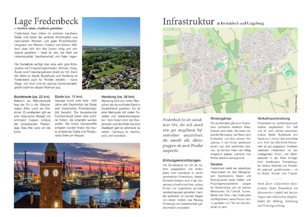 Durch die Nähe zu Stade (ca. 12 km), Buxtehude (ca. 22 km) und Hamburg (ca. 58 km) eignet sich Fredenbeck besonders für Pendler: Die Wege sind kurz, die Anbindung gut und die Orte bieten vielseitige kulturelle sowie historische Highlights. Insgesamt ist Fredenbeck ein ruhiger, lebenswerter Wohnort mit starkem Gemeinschaftsgefühl.