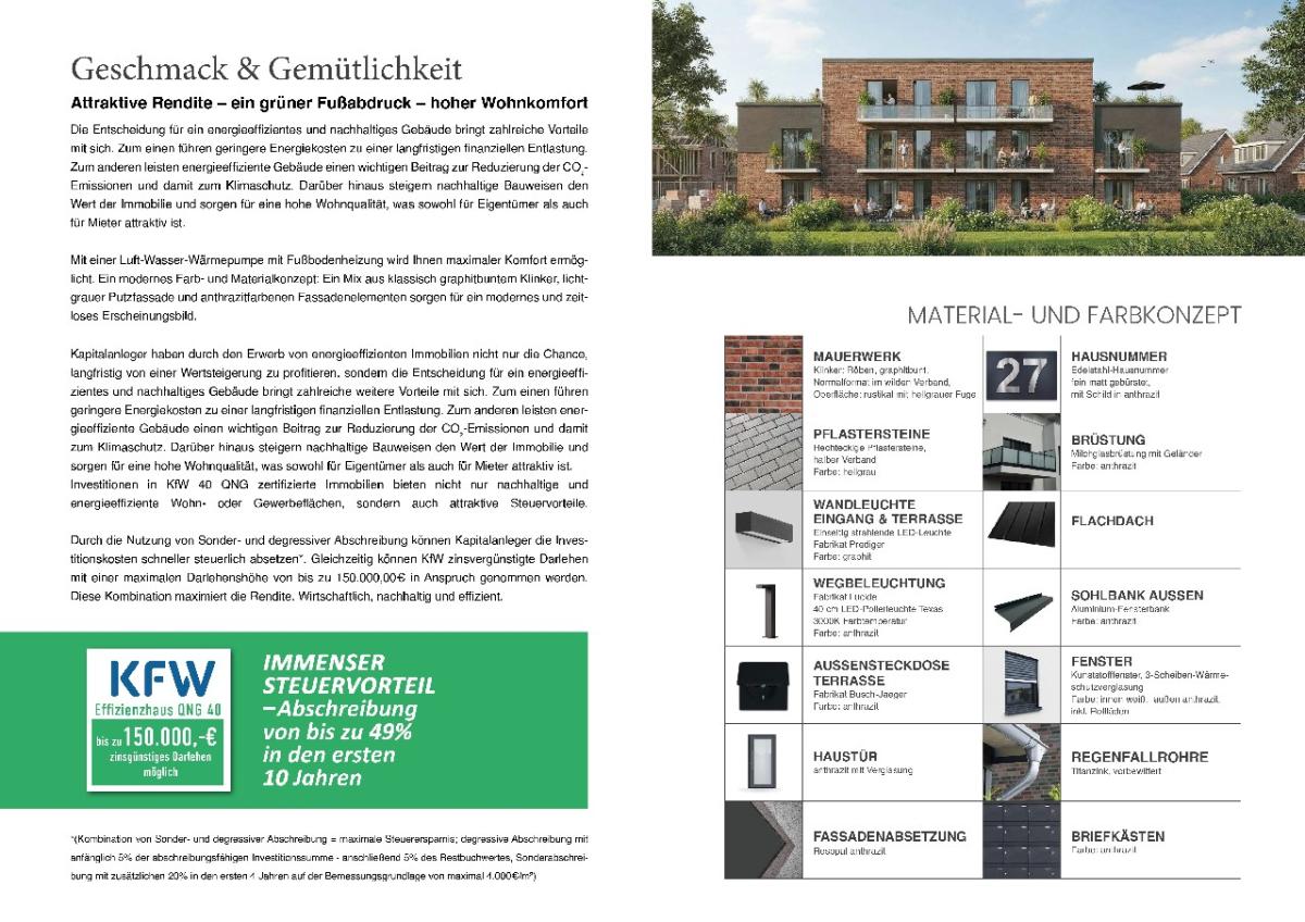 Investitionen in KfW 40 QNG zertifizierte Immobilien bieten nicht nur nachhaltige und energieeffiziente Wohn- oder Gewerbeflächen, sondern auch attraktive Steuervorteile. Durch die Nutzung von Sonder- und degressiver Abschreibung können Kapitalanleger die Investitionskosten schneller steuerlich absetzen*. Gleichzeitig können KfW zinsvergünstigte Darlehen mit einer maximalen Darlehenshöhe von 150.000,00EUR in Anspruch genommen werden. Diese Kombination maximiert die Rendite. Wirtschaftlich, nachhaltig bei hohem Wohnkomfort.