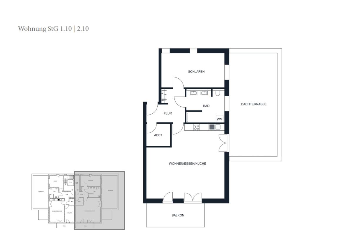 Diese großzügige 2-Zimmer-Staffelgeschosswohnung (WE 1.10) vereint Komfort, Stil und eine perfekte Raumaufteilung. Der großzügige Wohn-, Ess- und Kochbereich ist das Herzstück des Zuhauses – offen, lichtdurchflutet und mit direktem Zugang zur Dachterrasse und zum Balkon. Hier entstehen Lieblingsplätze – zum Entspannen, Kochen oder geselligen Beisammensein mit Freunden. Das Schlafzimmer bietet Ruhe und Rückzug, während das zusätzliche Zimmer flexibel nutzbar ist – ob als Homeoffice, Gästezimmer oder kleinem Wohlfühlraum für Kreatives. Ein modernes Bad mit Dusche und