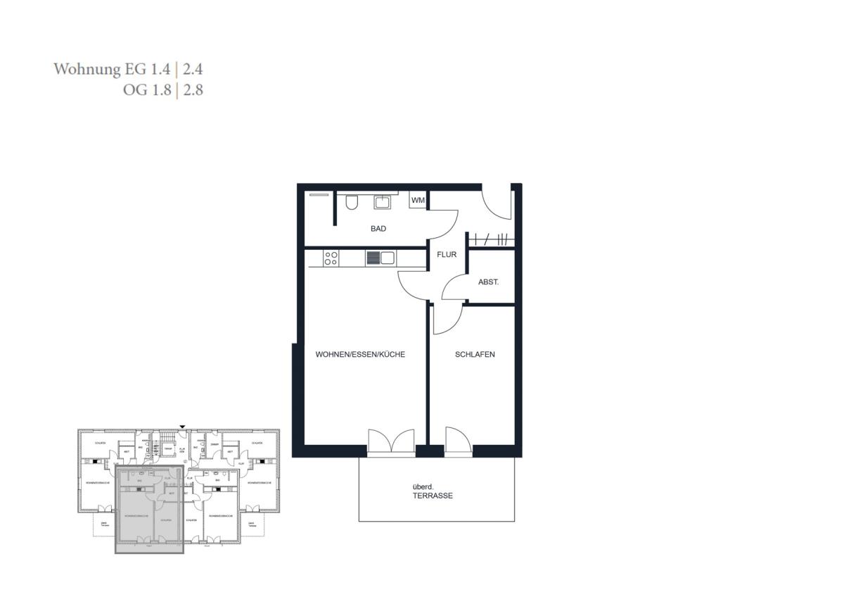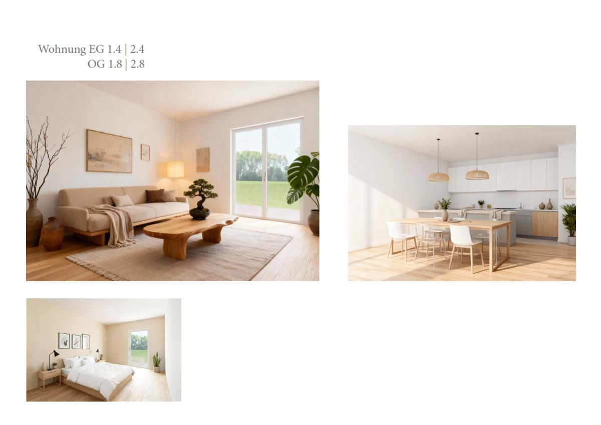 Diese moderne Obergeschosswohnung (WE 1.8) überzeugt auf Anhieb mit einem durchdachten Grundriss und einer gemütlichen Atmosphäre. Herzstück der Wohnung ist der offene Wohn-, Ess- und Kochbereich – hier trifft gemeinsames Kochen auf entspanntes Wohnen. Große Fenster sorgen für viel Licht und schaffen ein helles, freundliches Ambiente. Vom Wohnzimmer aus gelangen Sie direkt auf den Balkon – perfekt, um den Tag mit einem Kaffee zu beginnen oder einem Glas Wein gemütlich ausklingen zu lassen.