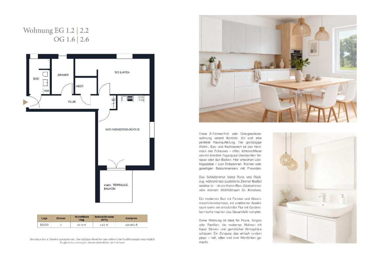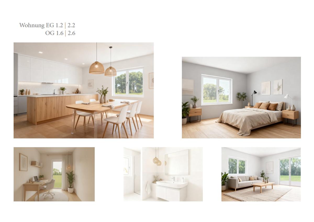 Diese 3-Zimmer-Erdgeschosswohnung (WE 1.2) vereint Komfort, Stil und eine perfekte Raumaufteilung. Der großzügige Wohn-, Ess- und Kochbereich ist das Herzstück des Zuhauses – offen, lichtdurchflutet und mit direktem Zugang zur überdachten Terrasse oder den Balkon. Hier entstehen Lieblingsplätze zum Entspannen, Kochen oder geselligen Beisammensein mit Freunden. Das Schlafzimmer bietet Ruhe und Rückzug, während das zusätzliche Zimmer flexibel nutzbar ist – ob als Homeoffice, Gästezimmer oder kleinem Wohlfühlraum für Kreatives.