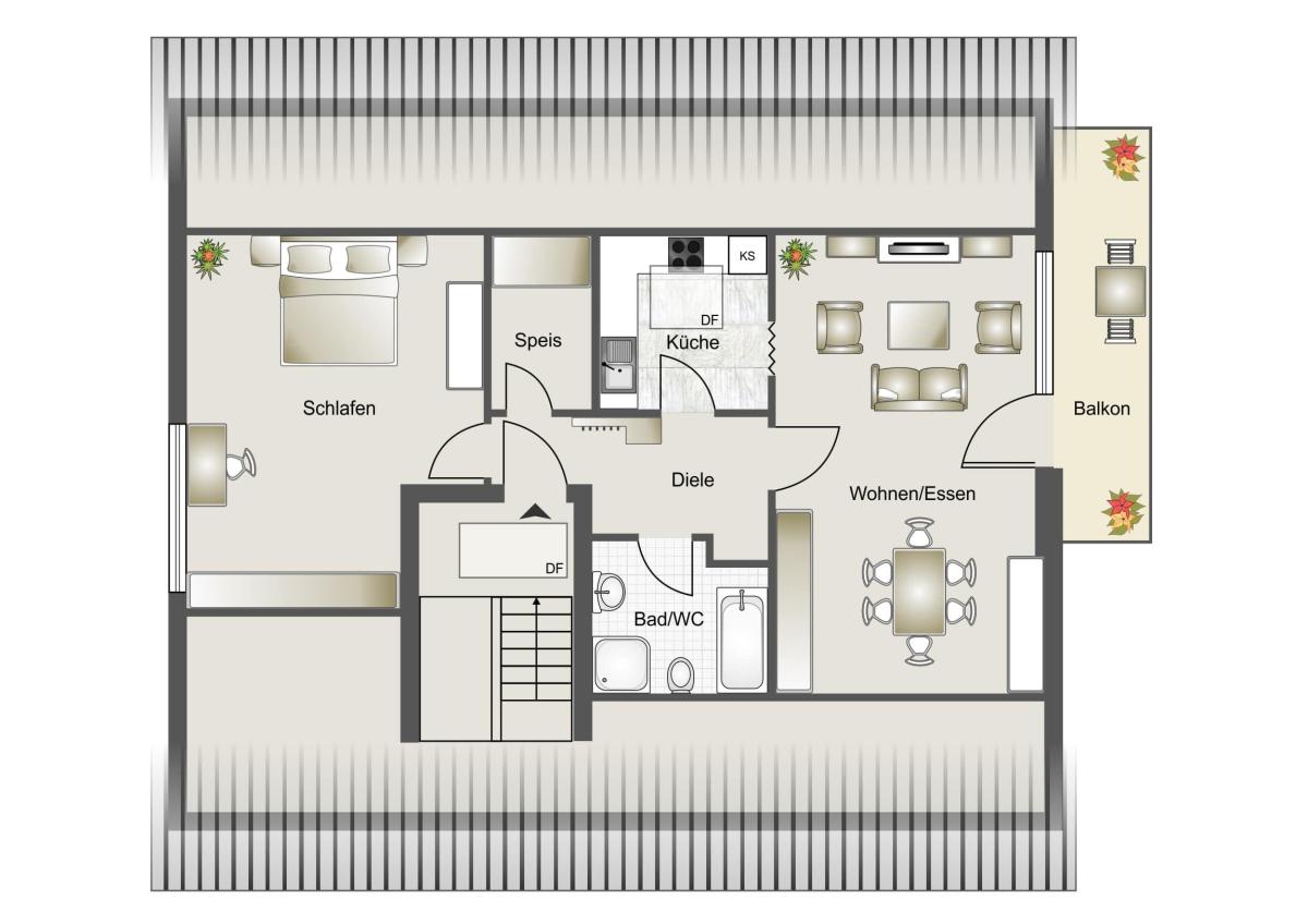 Dachgeschoss, ca. 65 m² Wohnfläche laut Mietvertrag, 2 Zimmer, Küche, Diele, Bad, Balkon