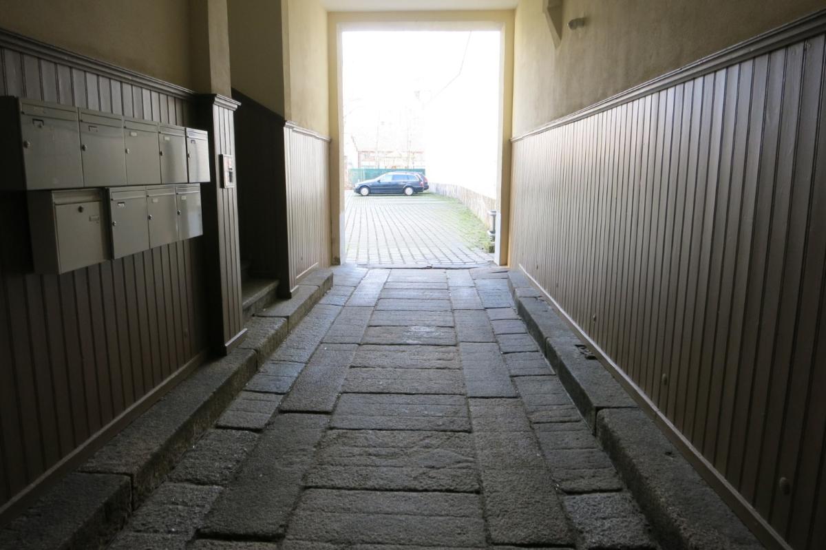 Über den Durchgang im Haus gelangt man direkt vom Straßenbereich in den Hof. Von hier aus erschließt sich auch das Treppenhaus mit Zugang zu den einzelnen Wohnungen. Die Rückseite des Gebäudes verfügt über mehrere Balkone, die sämtlichen Wohnungen zusätzlichen Freiraum im Außenbereich bieten.