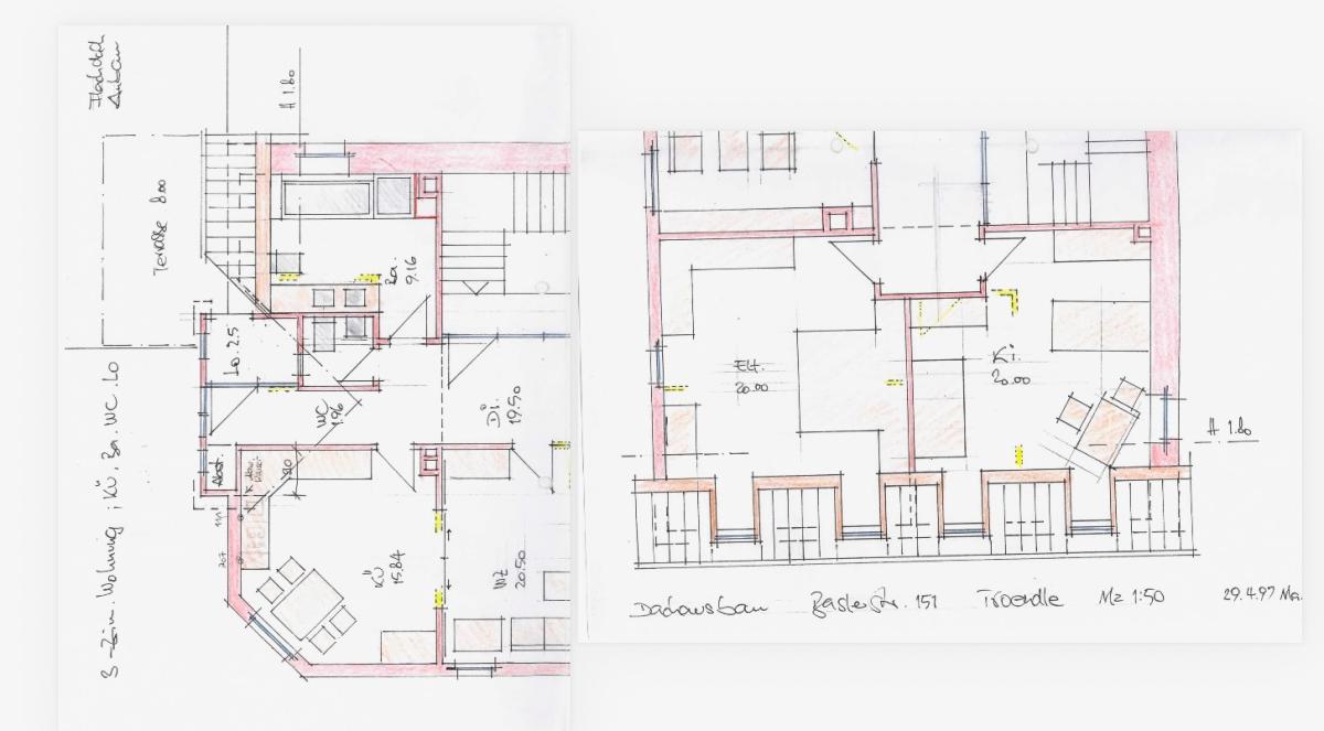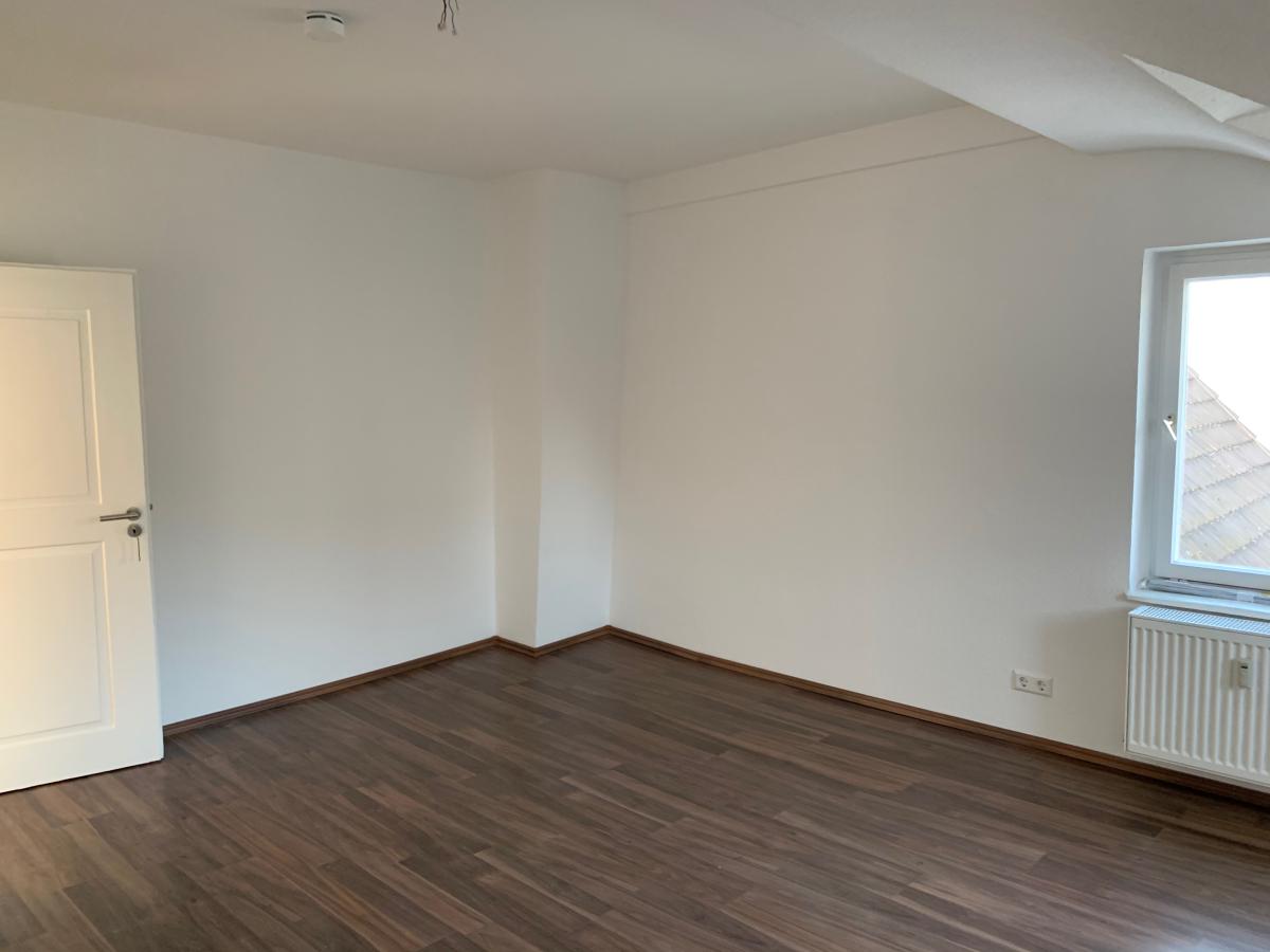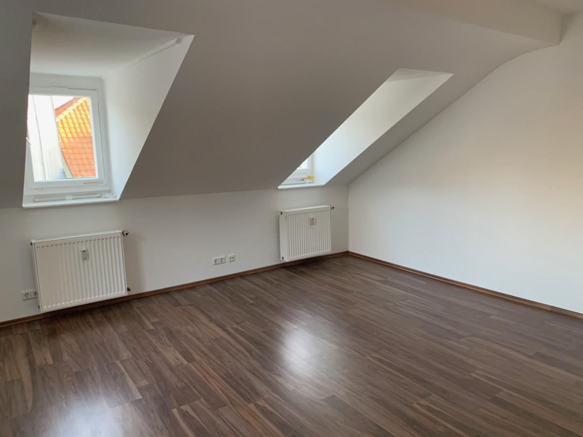 Diese 3,5 Zimmer-Dachgeschosswohnung besteht aus 2 identischen Schlafzimmer mit jeweils drei Fenstern, einem Wohnzimmer mit Glastür und Schiebetür zum angrenzenden Essbereich mit Küche.
